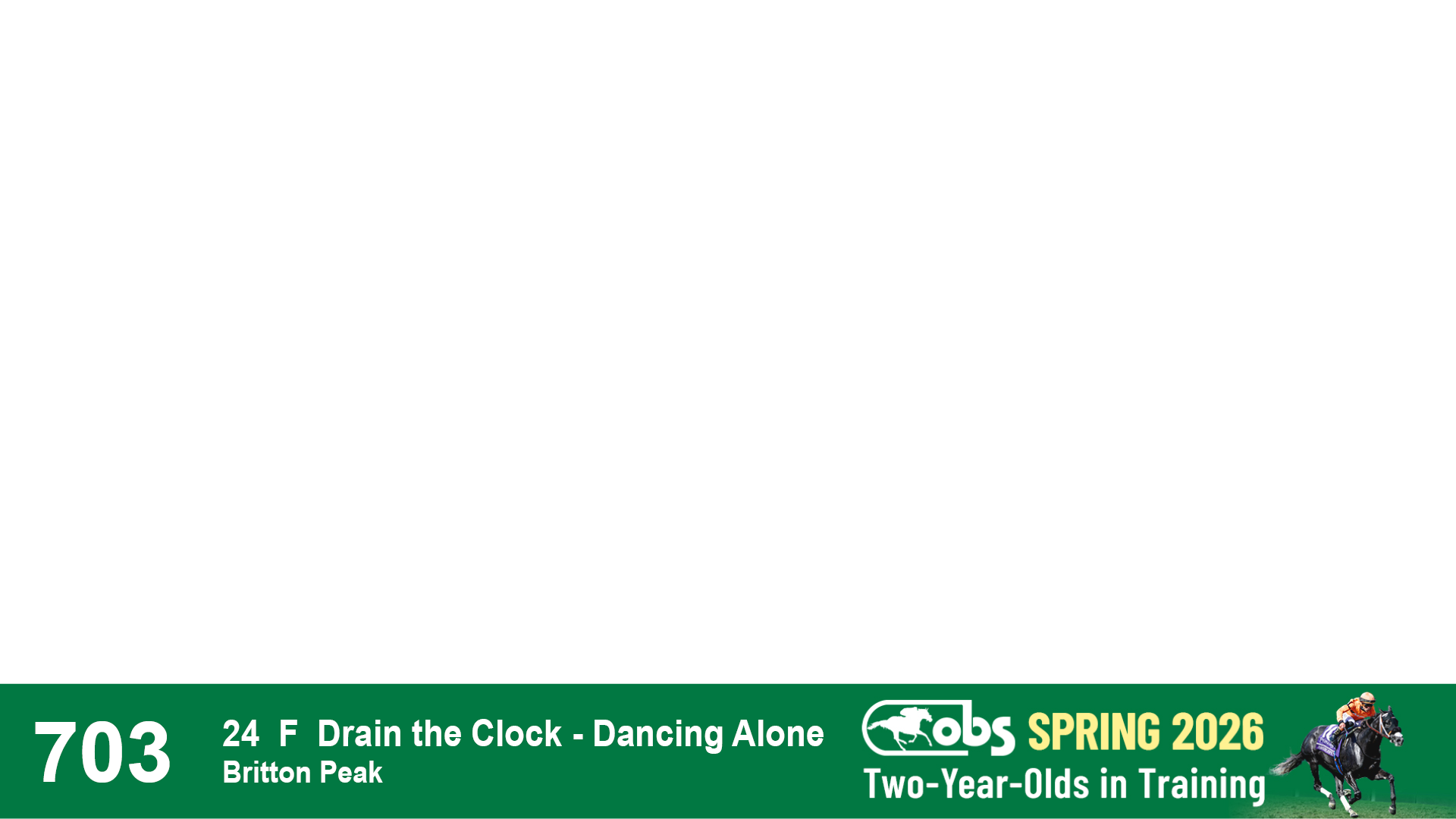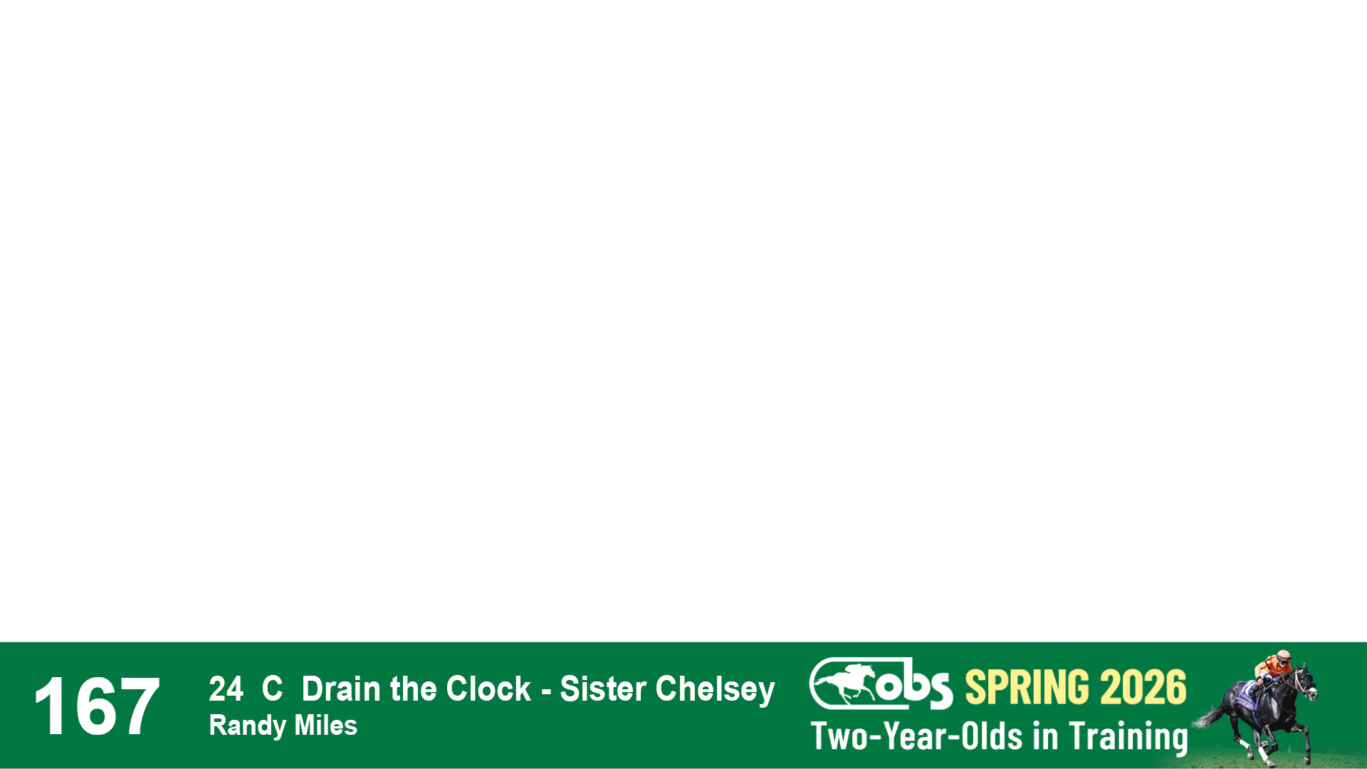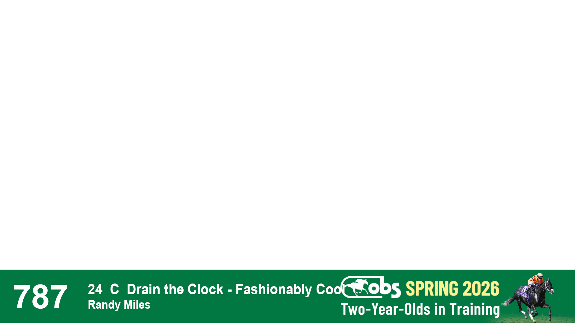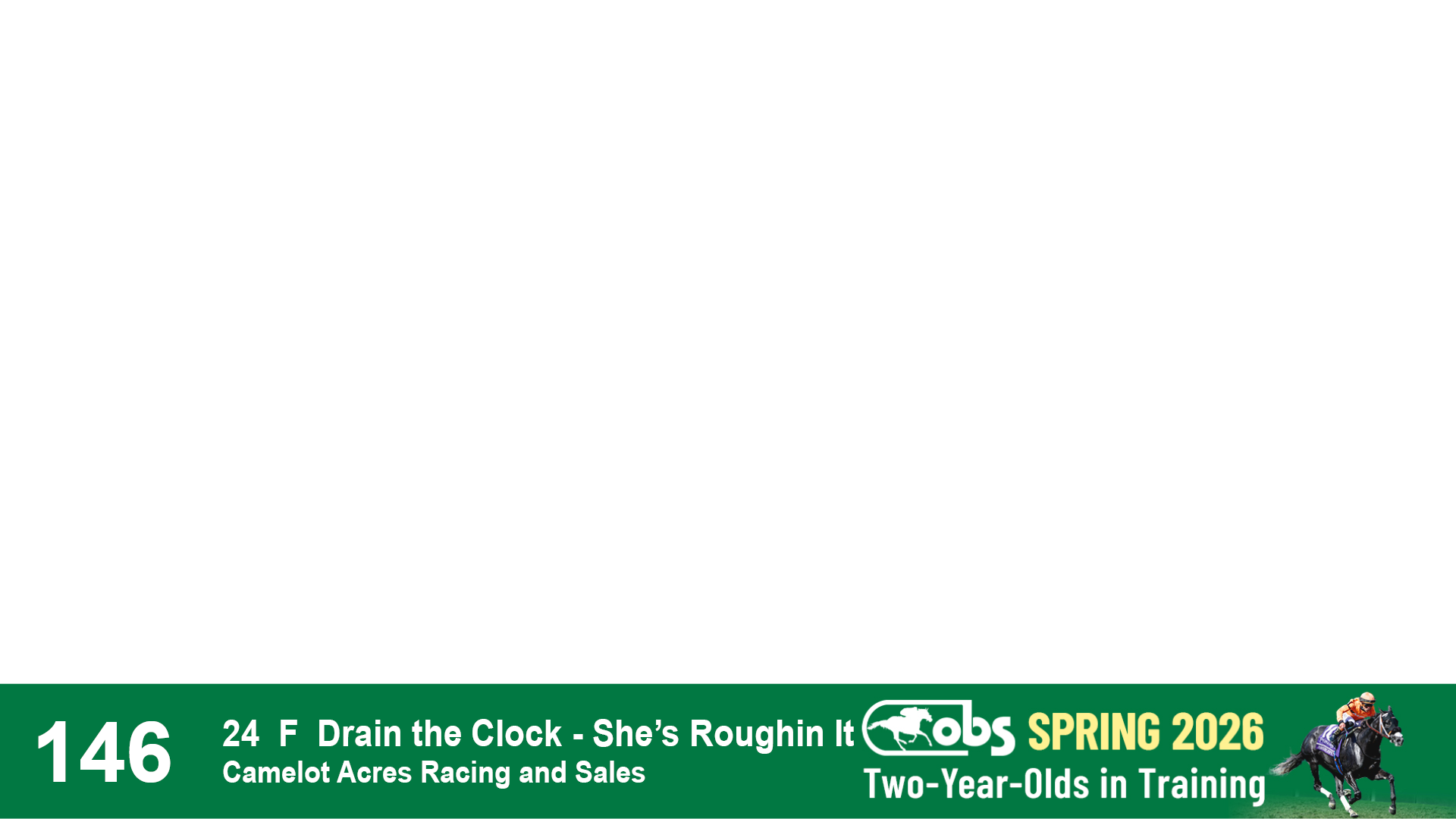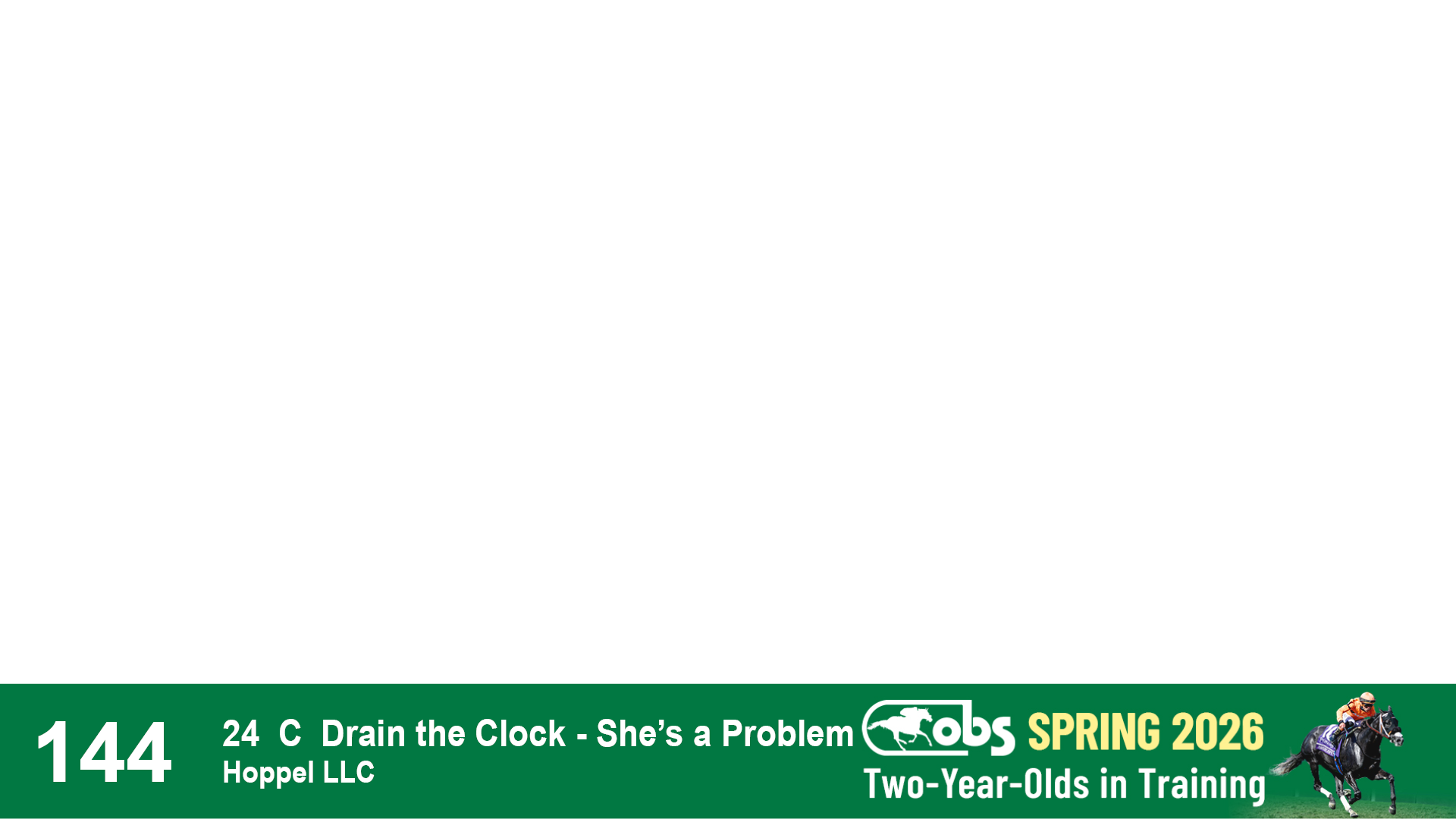 | 1143 | Slate | Lower-Third | 2/2/2024 | C | Drain the Clock | Moment to Dream | Niall Brennan Stables, Agent VIII | 1148 | 278 | 730 | 664 | |