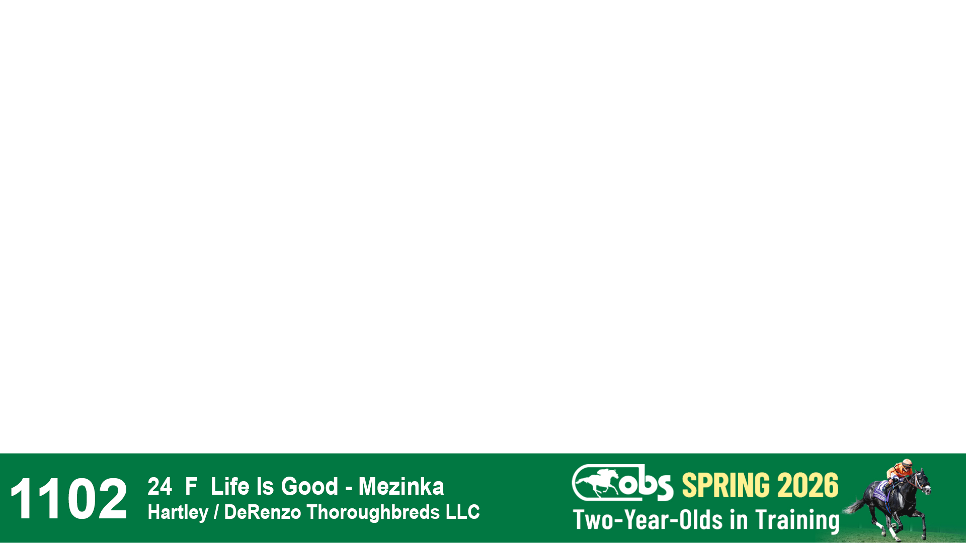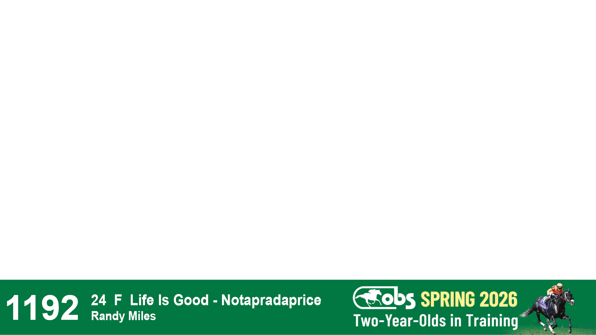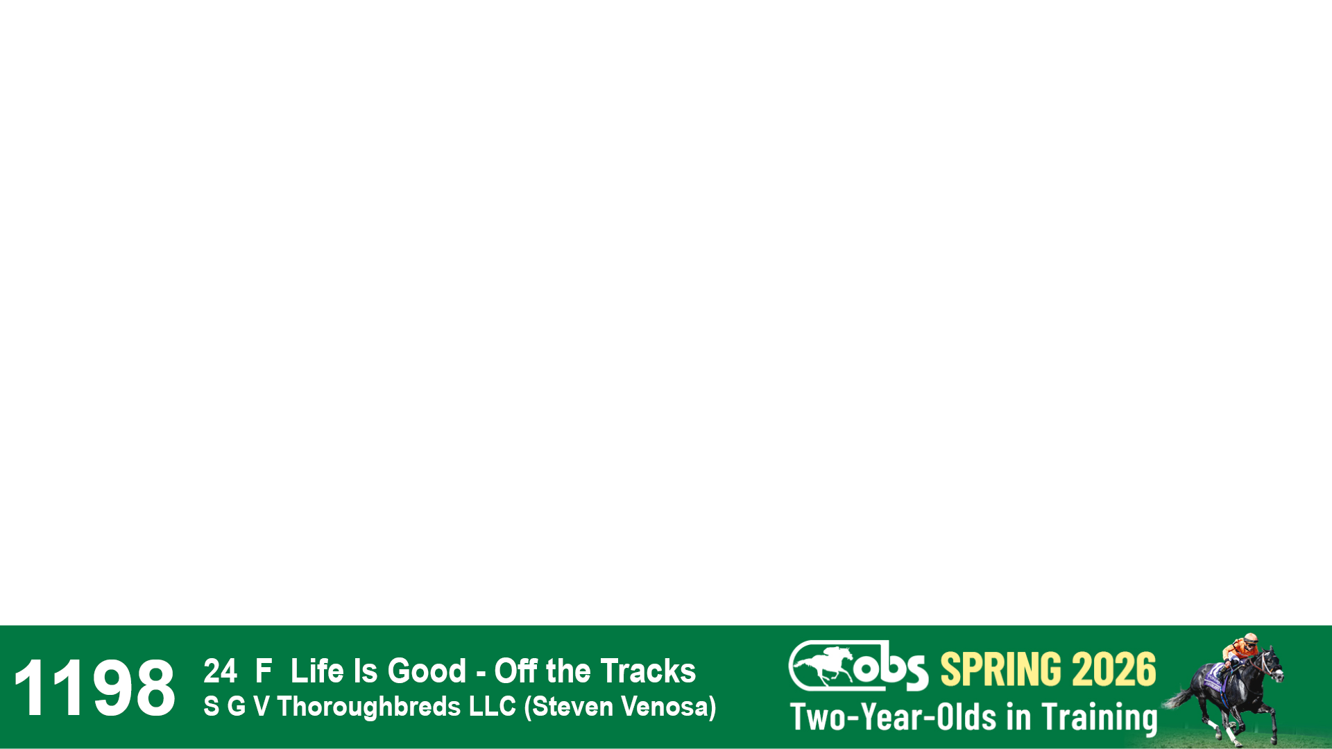 | 1198 | Slate | Lower-Third | 2/26/2024 | F | Life Is Good | Off the Tracks | S G V Thoroughbreds LLC (Steven Venosa), Agent | 1201 | 674 | 785 | 1002 | |