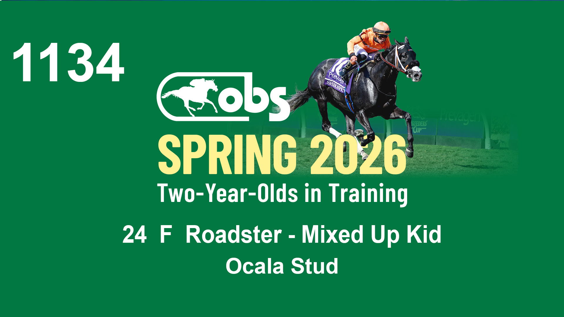 | 1134 | Slate | Lower-Third | 4/11/2024 | F | Roadster | Mixed Up Kid | Ocala Stud, Agent | 1139 | 991 | 721 | 726 | |