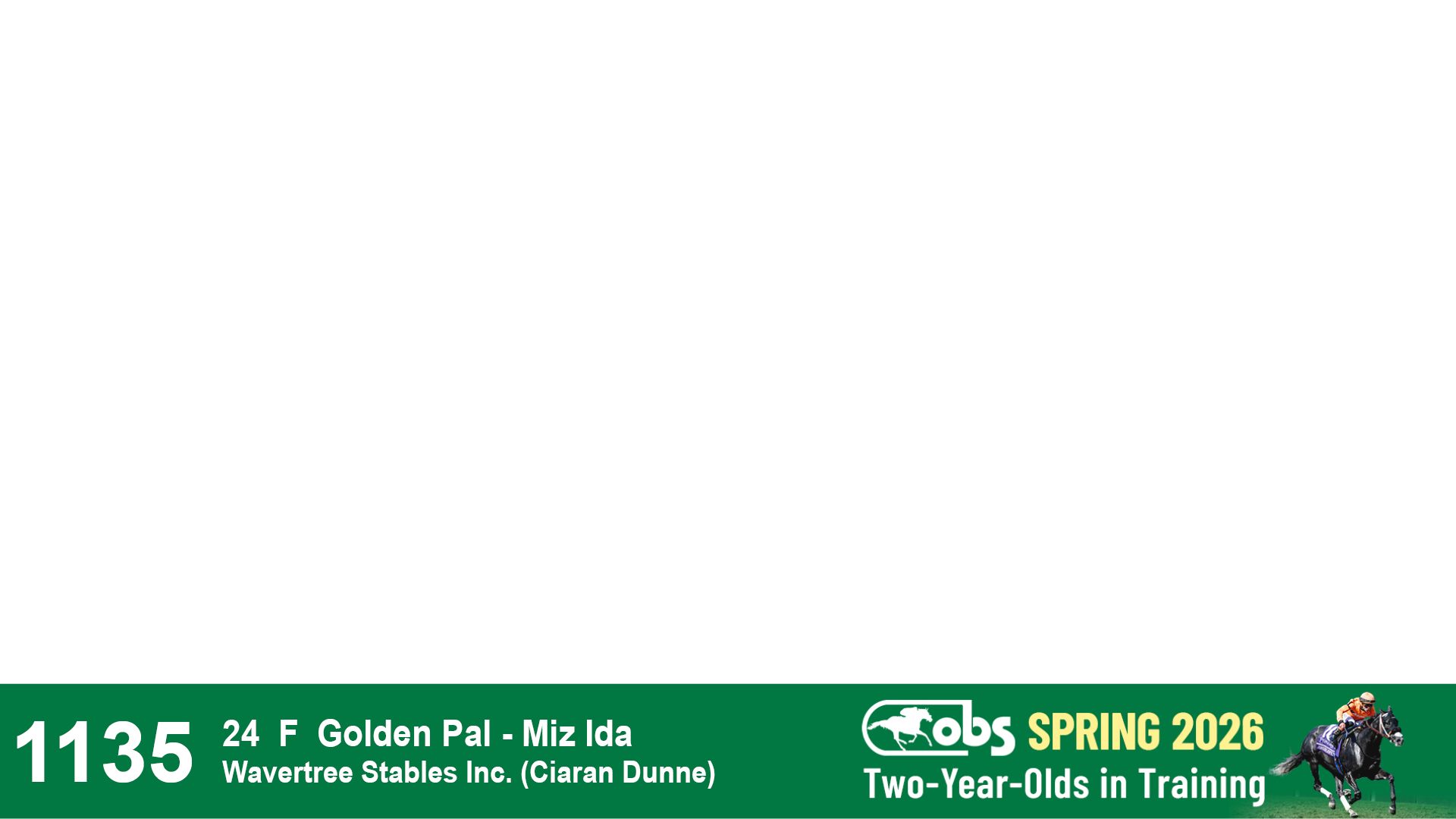 | 1135 | Slate | Lower-Third | 4/2/2024 | F | Golden Pal | Miz Ida | Wavertree Stables, Inc. (Ciaran Dunne), Agent VII | 1140 | 445 | 722 | 1195 | |
