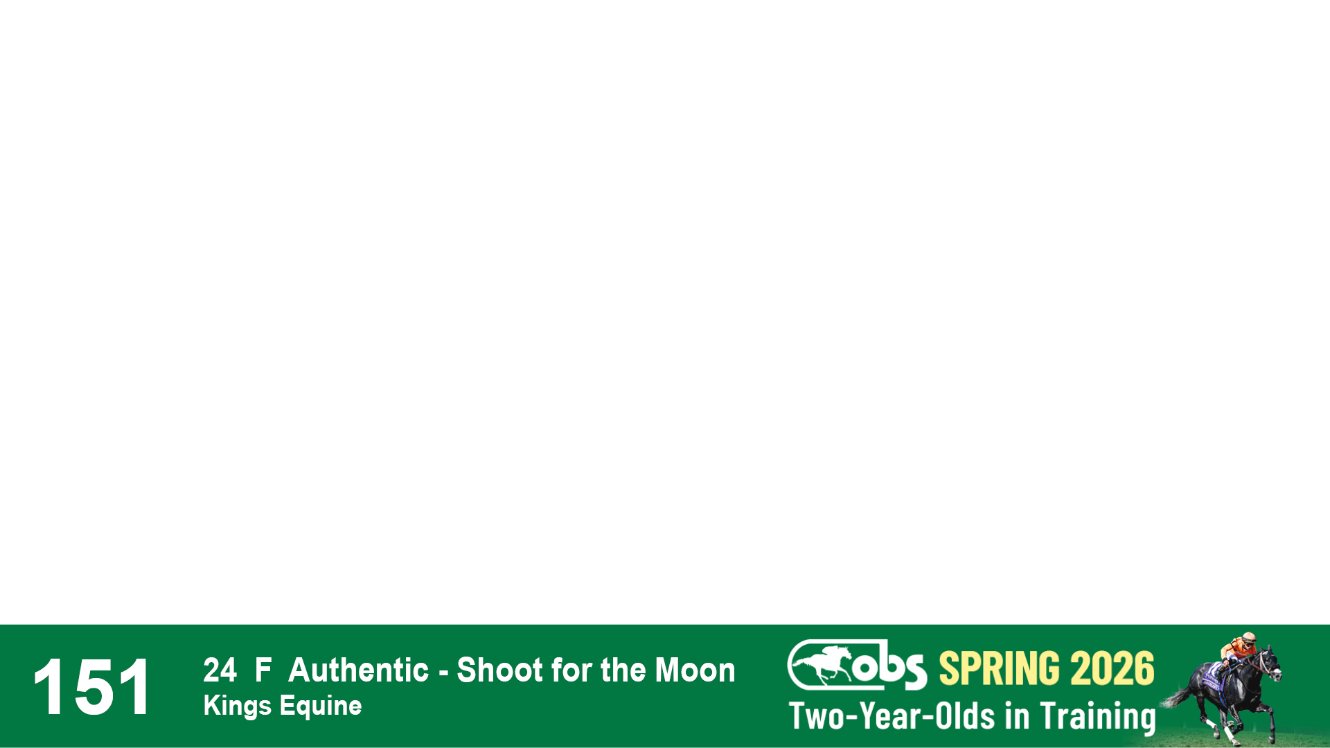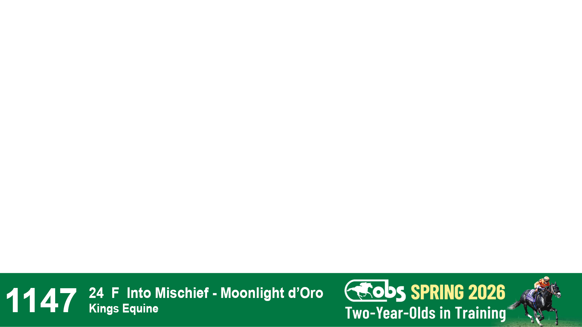 | 1147 | Slate | Lower-Third | 1/24/2024 | F | Into Mischief | Moonlight d'Oro | Kings Equine, Agent VIII | 1152 | 544 | 734 | 528 | |