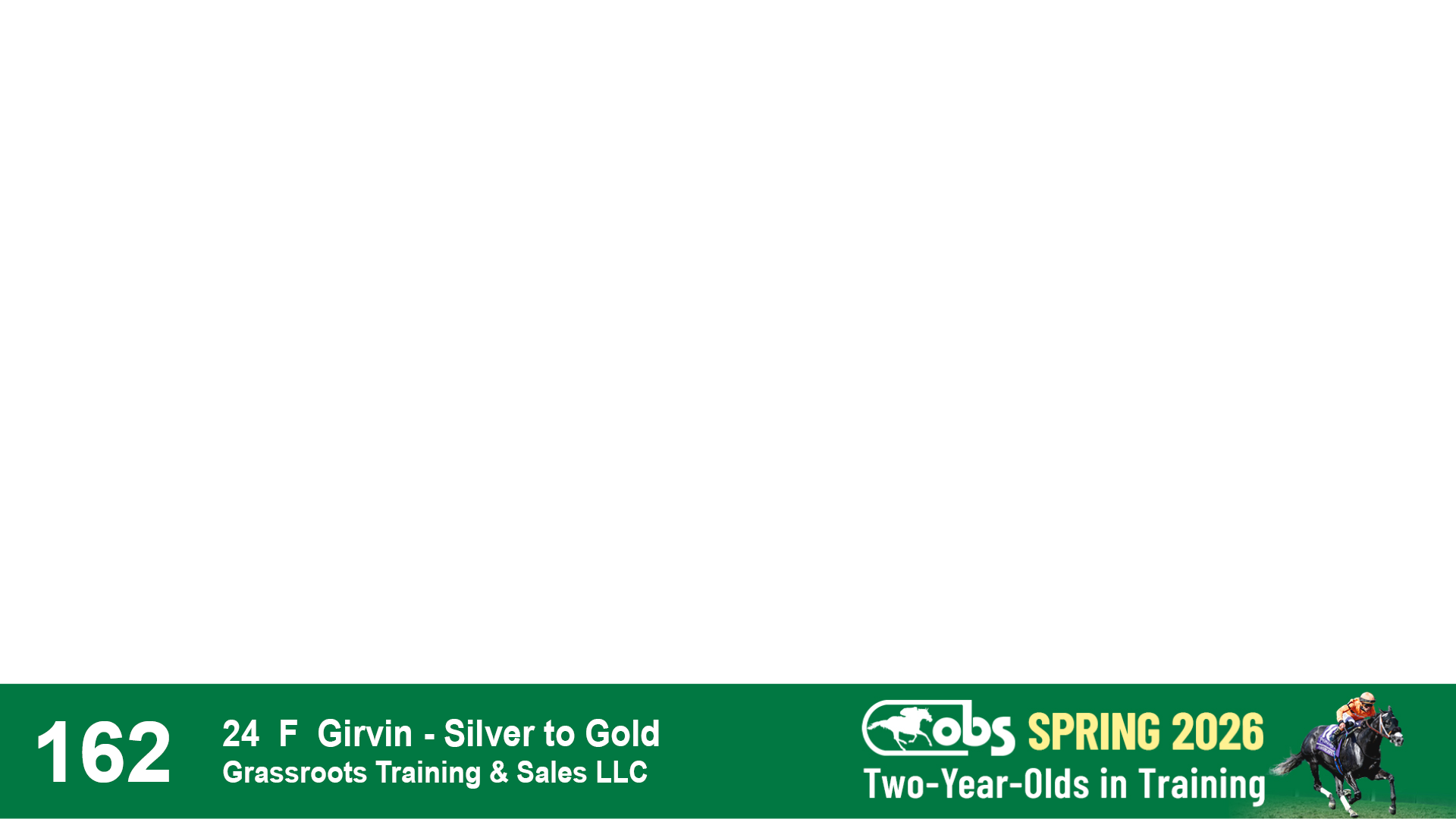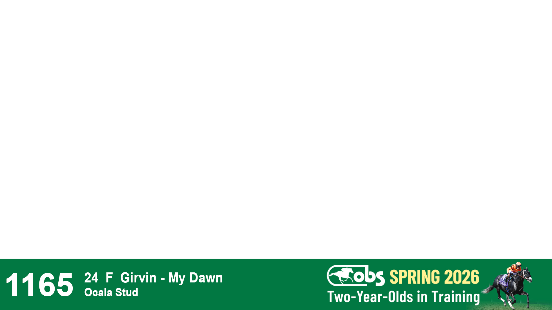 | 1165 | Slate | Lower-Third | 4/23/2024 | F | Girvin | My Dawn | Ocala Stud, Agent | 1170 | 402 | 752 | 727 | |