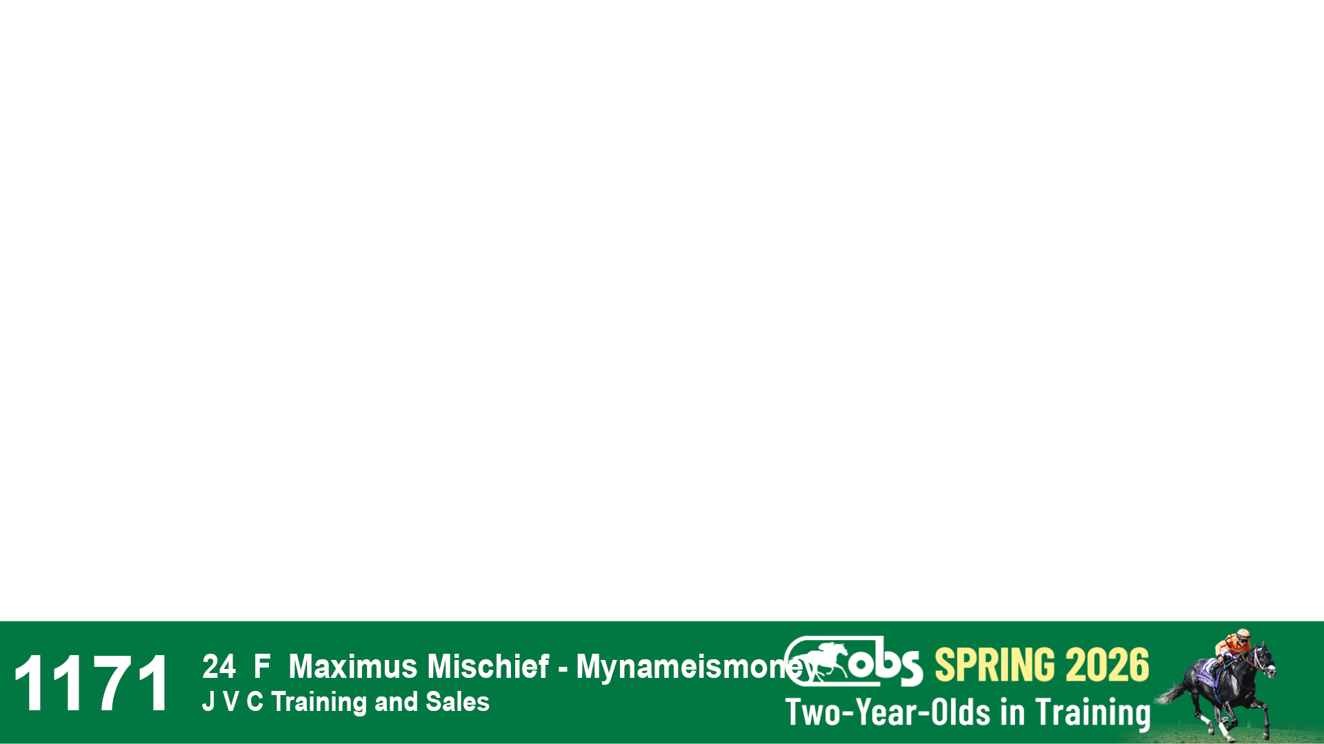 | 1171 | Slate | Lower-Third | 4/9/2024 | F | Maximus Mischief | Mynameismoney | J V C Training and Sales | 1175 | 731 | 758 | 498 | |