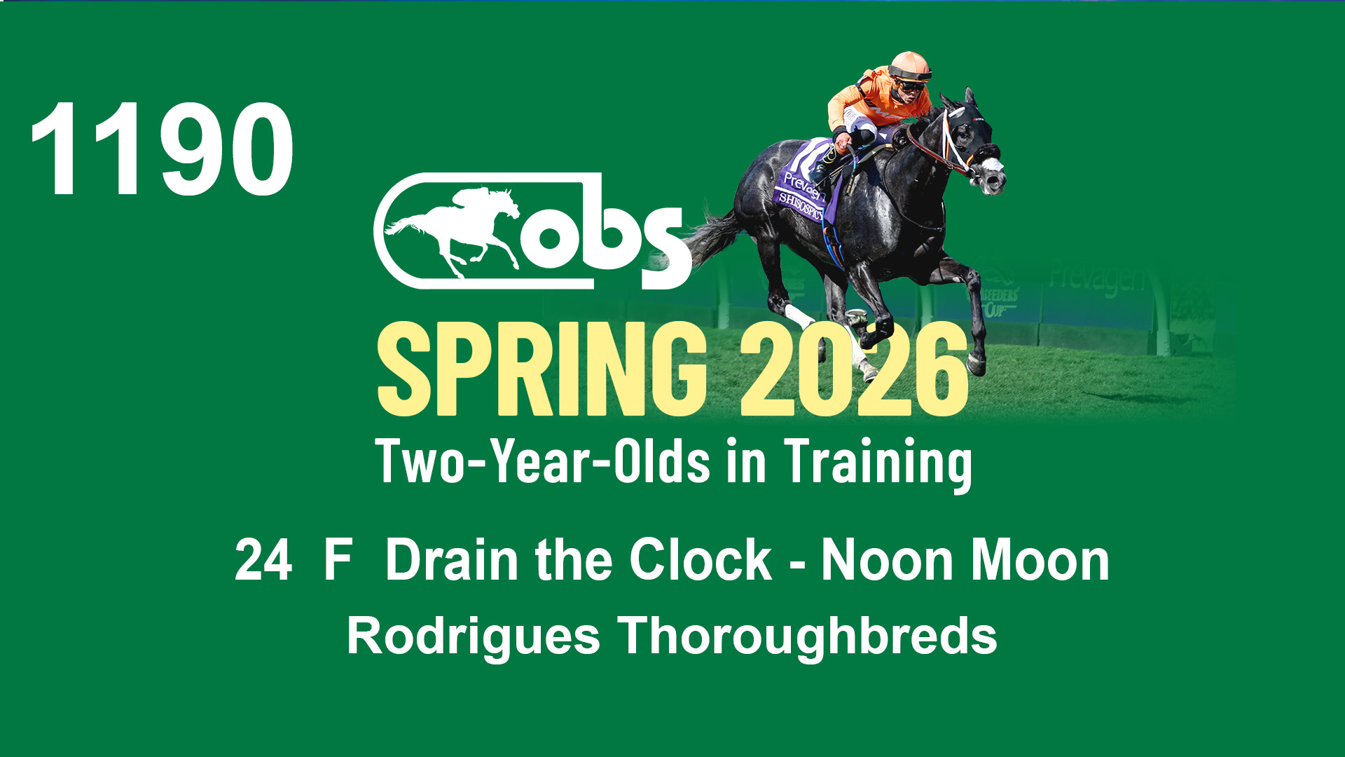 | 1190 | Slate | Lower-Third | 3/31/2024 | F | Drain the Clock | Noon Moon | Rodrigues Thoroughbreds, Agent | 1193 | 280 | 777 | 909 | |
