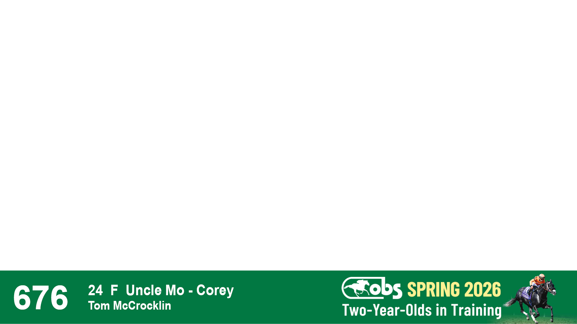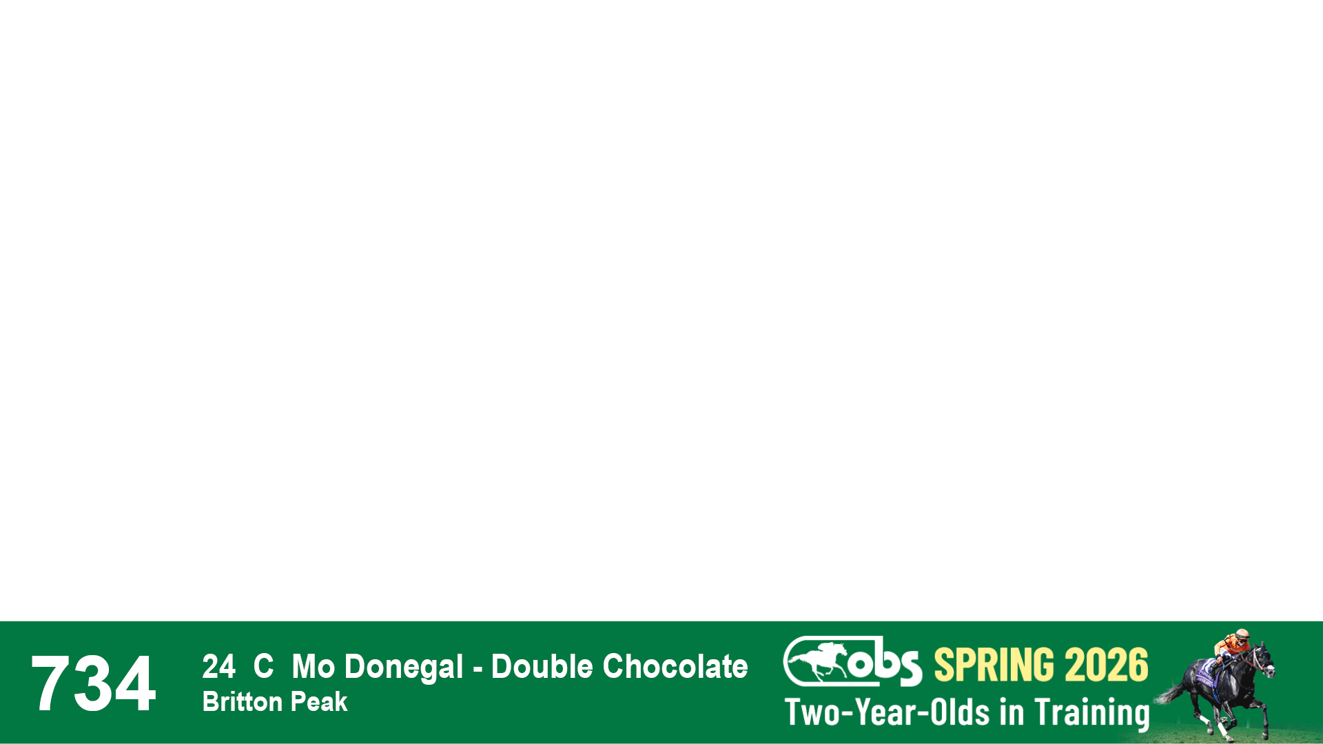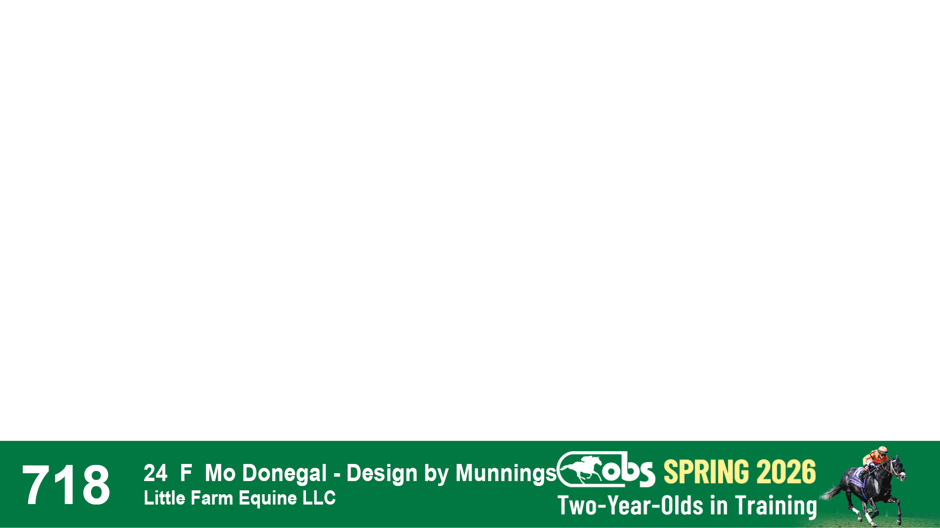 | 1157 | Slate | Lower-Third | 4/17/2024 | F | Mo Donegal | Mrs. Awesome | Centofanti Thoroughbreds, Agent II | 1162 | 802 | 744 | 123 | |