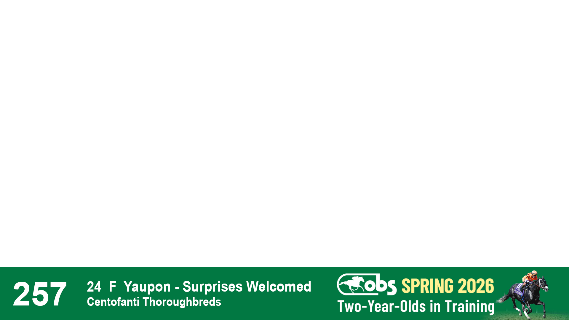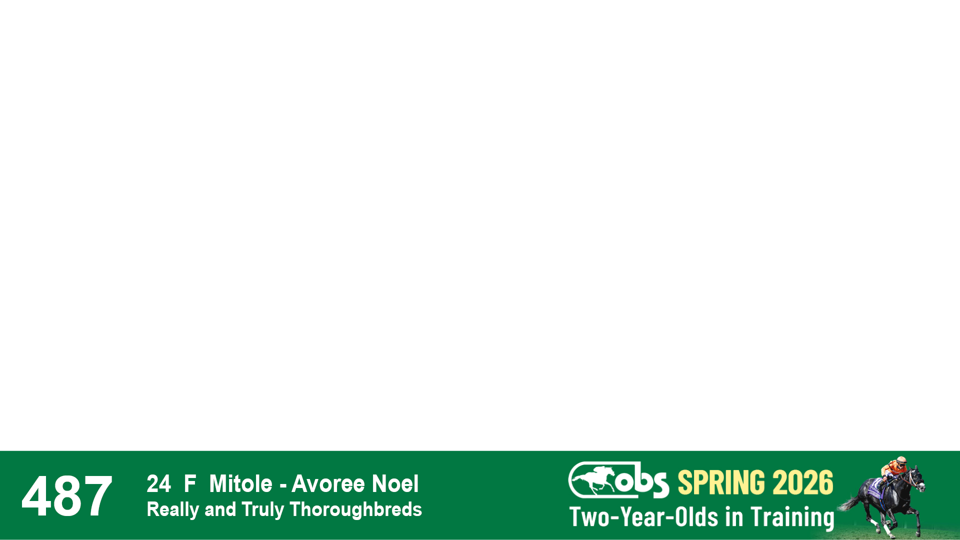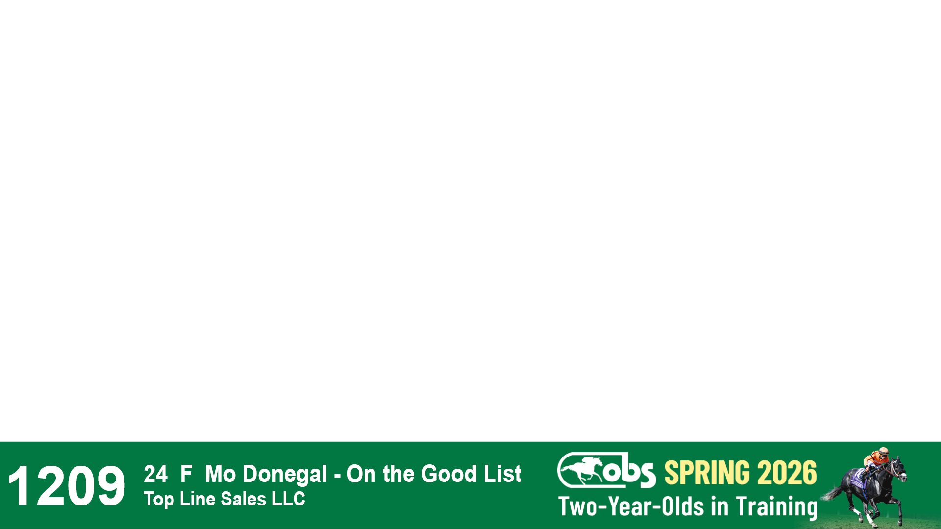 | 1157 | Slate | Lower-Third | 4/17/2024 | F | Mo Donegal | Mrs. Awesome | Centofanti Thoroughbreds, Agent II | 1162 | 802 | 744 | 123 | |