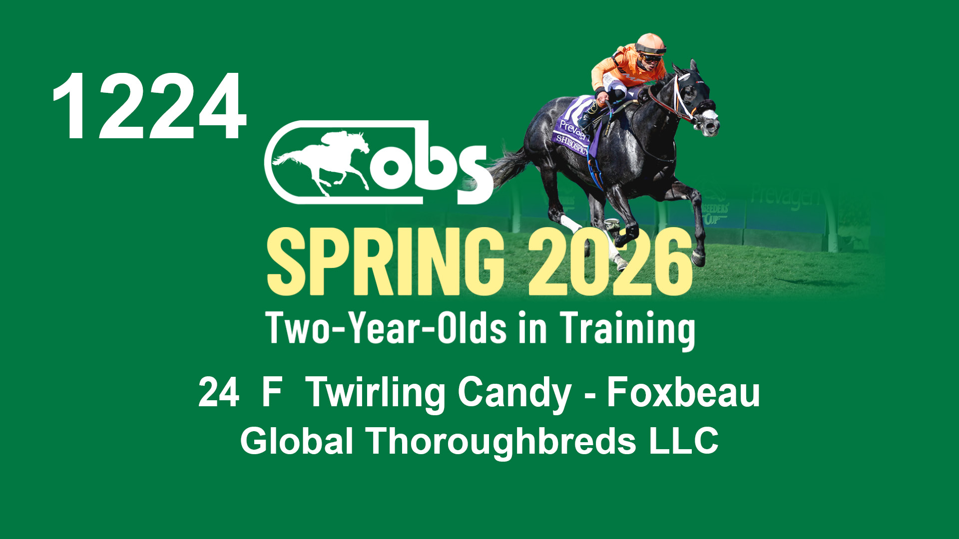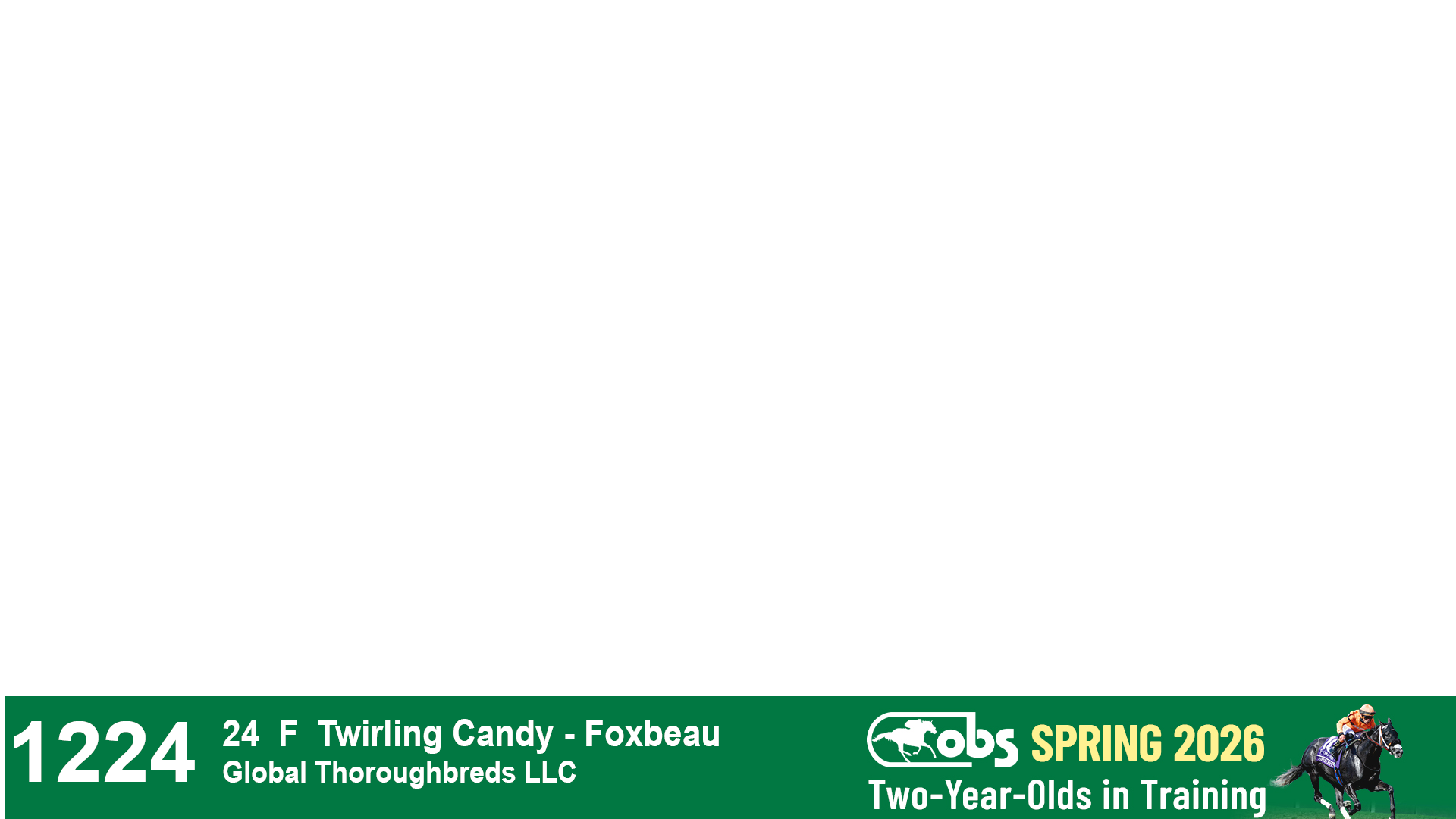 | 1224 | Slate | Lower-Third | 3/15/2024 | F | Twirling Candy | Foxbeau | Global Thoroughbreds LLC, Agent II | 1224 | 1089 | 416 | 258 |