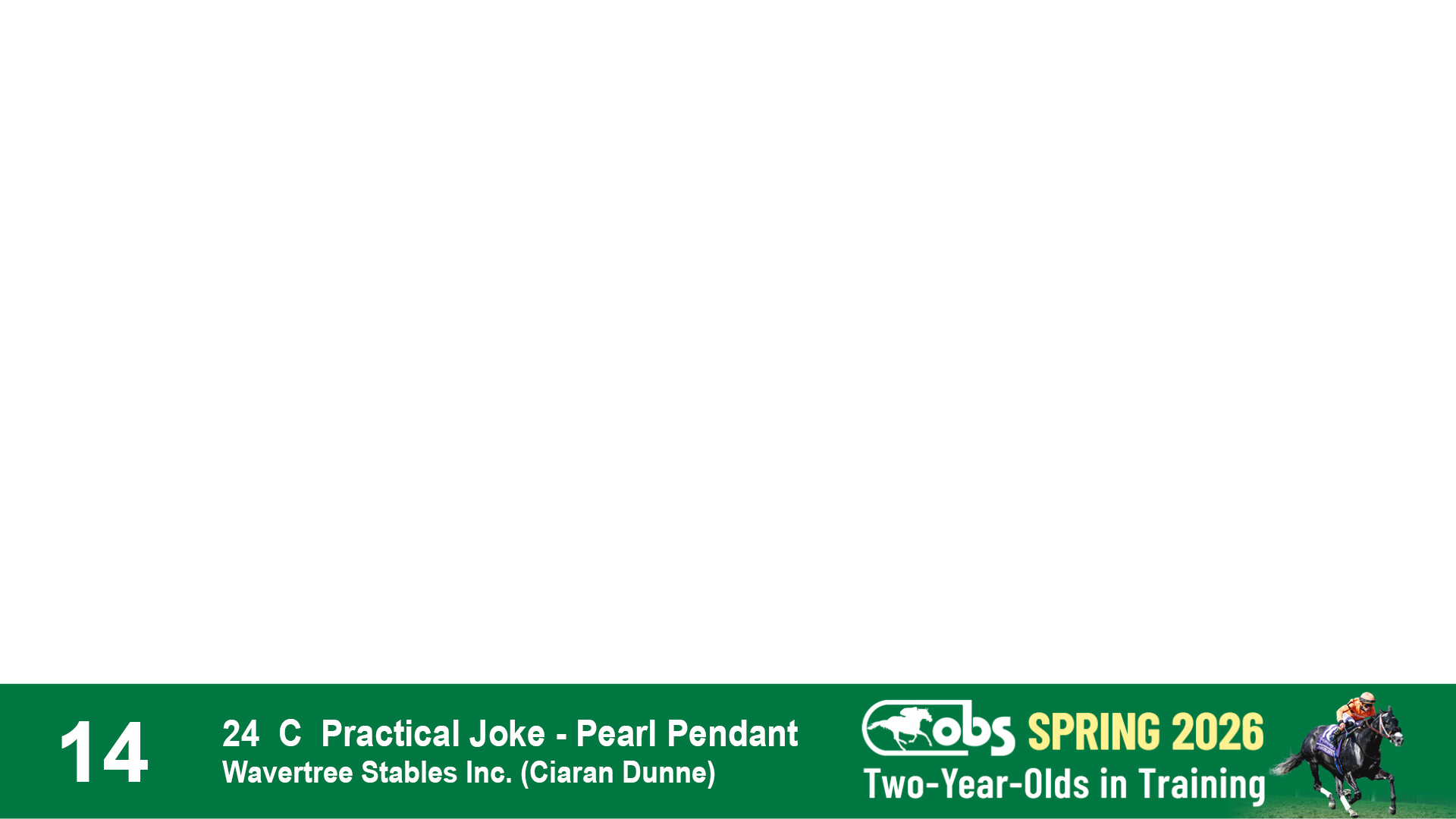 | 14 | Slate | Lower-Third | 4/20/2024 | C | Be a Clown | Practical Joke | Pearl Pendant | Wavertree Stables, Inc. (Ciaran Dunne), Agent VII | 4 | 937 | 821 | 1191 |