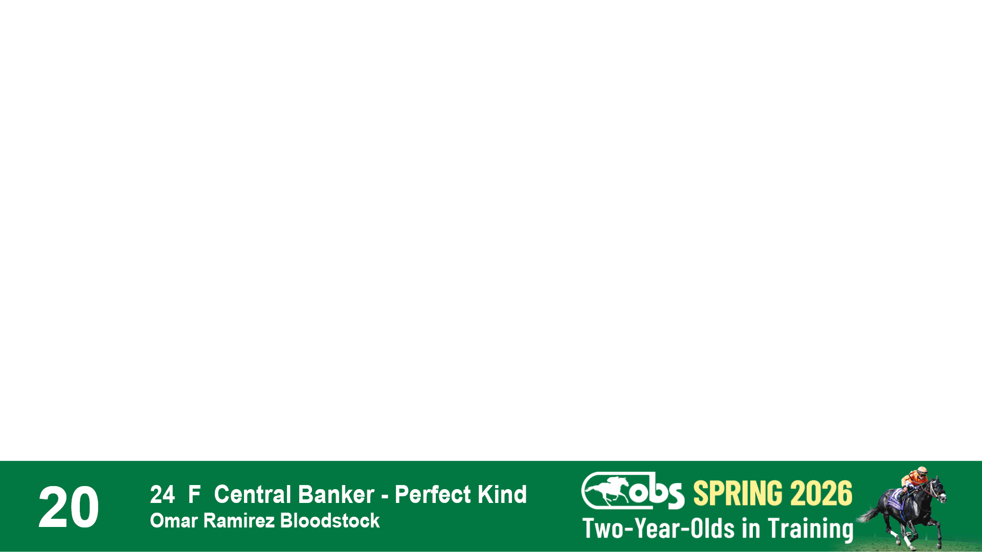 | 20 | Slate | Lower-Third | 4/2/2024 | F | Central Banker | Perfect Kind | Omar Ramirez Bloodstock, Agent I | 96 | 89 | 827 | 728 | |
