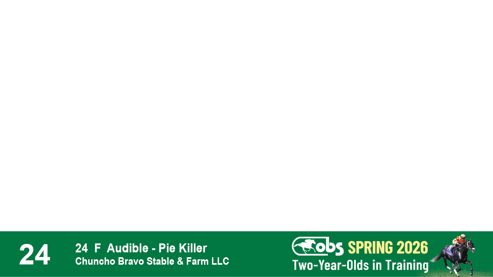 | 24 | Slate | Lower-Third | 1/19/2024 | F | Sweet Attraction | Audible | Pie Killer | Chuncho Bravo Stable & Farm LLC | 67 | 23 | 831 | 134 |