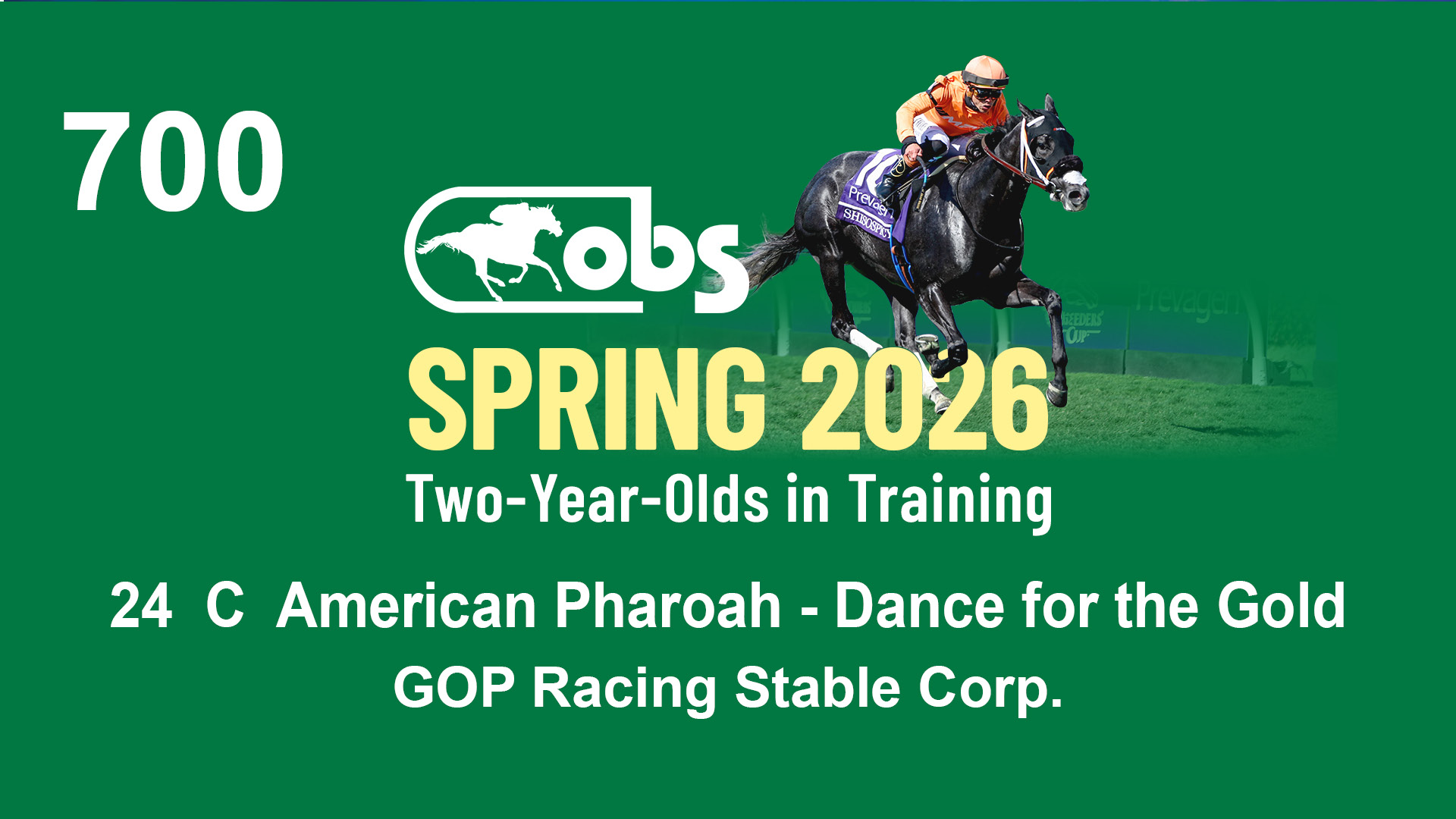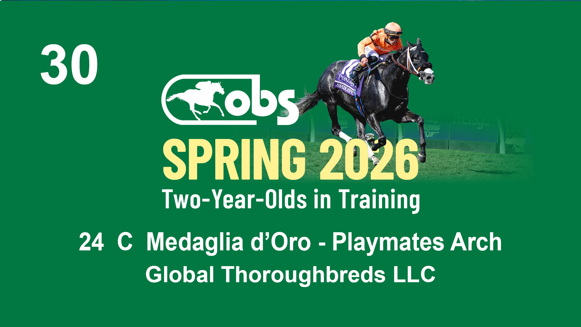 | 30 | Slate | Lower-Third | 4/6/2024 | C | Medaglia d'Oro | Playmates Arch | Global Thoroughbreds LLC, Agent | 105 | 750 | 837 | 246 | |