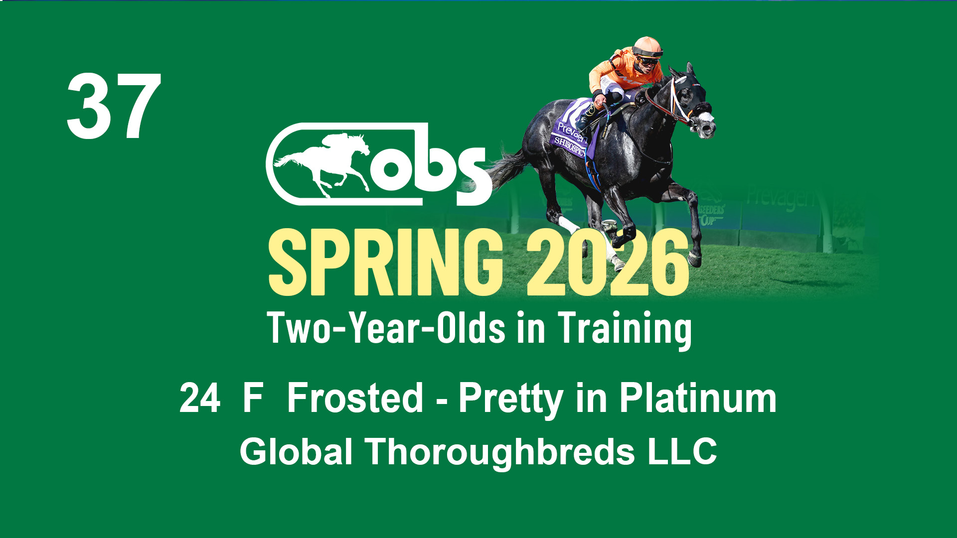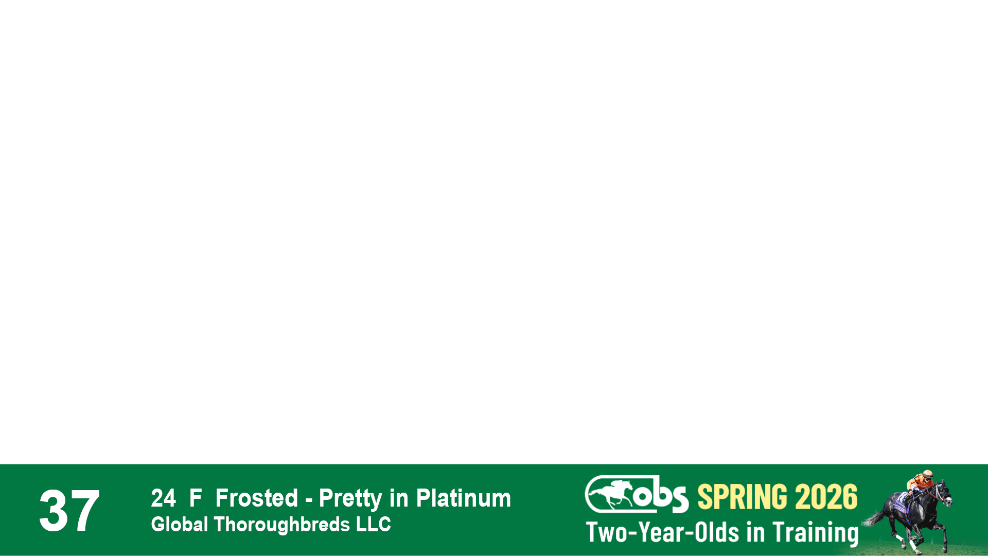 | 37 | Slate | Lower-Third | 4/29/2024 | F | Frosted | Pretty in Platinum | Global Thoroughbreds LLC, Agent | 112 | 366 | 844 | 247 | |