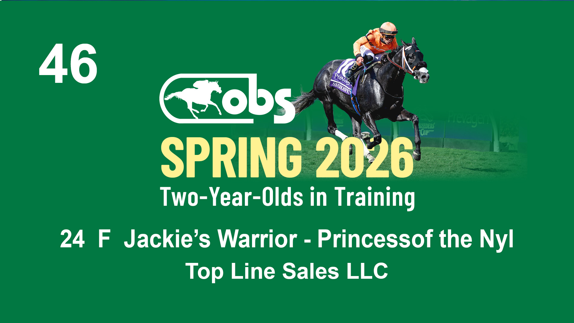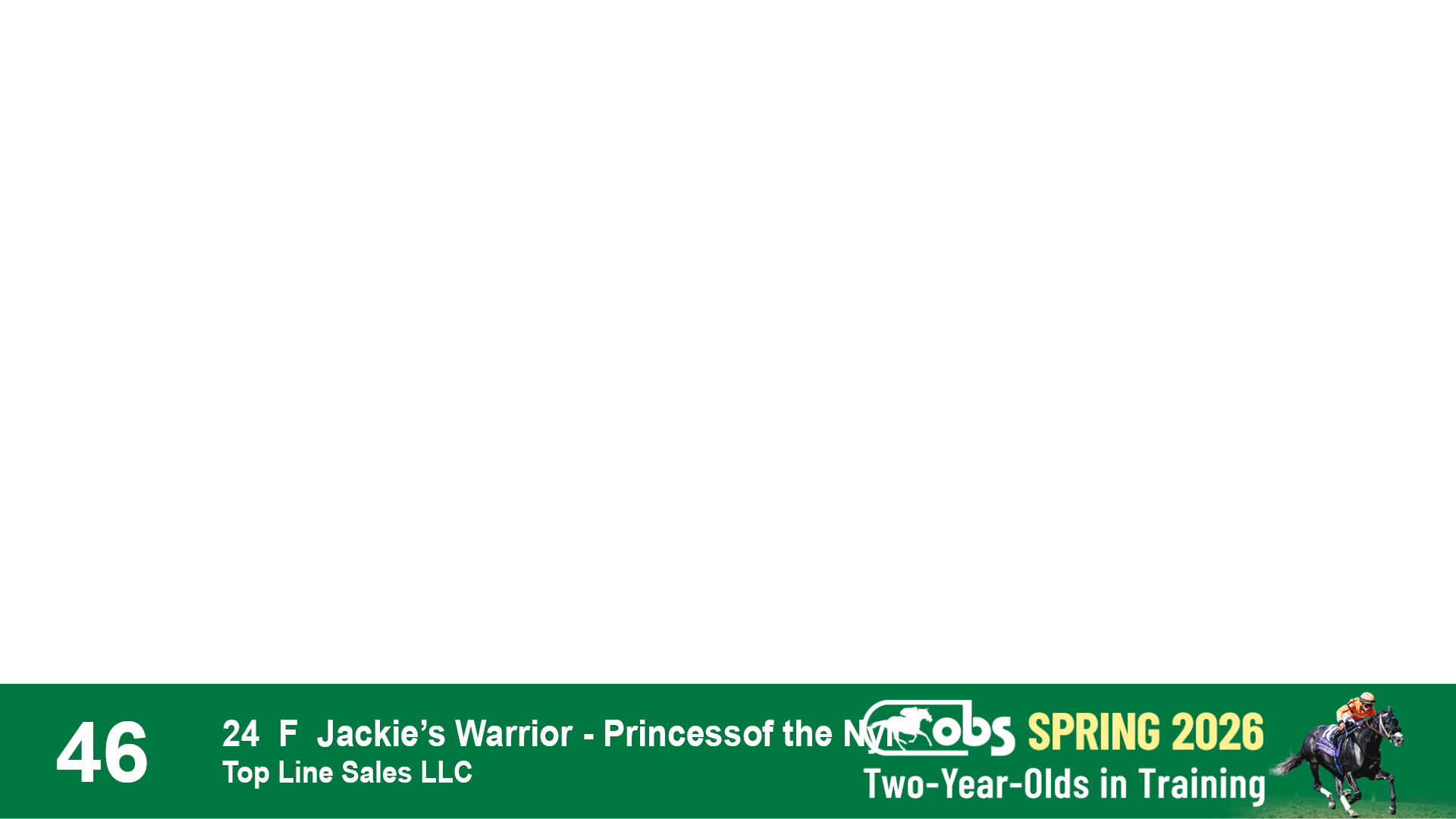 | 46 | Slate | Lower-Third | 4/3/2024 | F | Jackie's Warrior | Princessof the Nyl | Top Line Sales LLC, Agent XLIX | 121 | 591 | 853 | 1133 | |