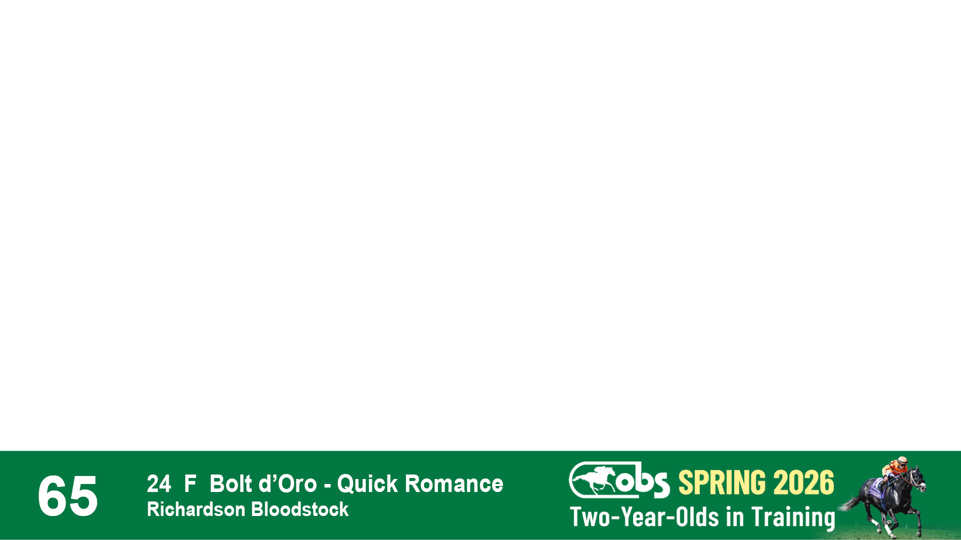 | 65 | Slate | Lower-Third | 2/20/2024 | F | Bolt d'Oro | Quick Romance | Richardson Bloodstock, Agent VI | 139 | 55 | 871 | 898 | |