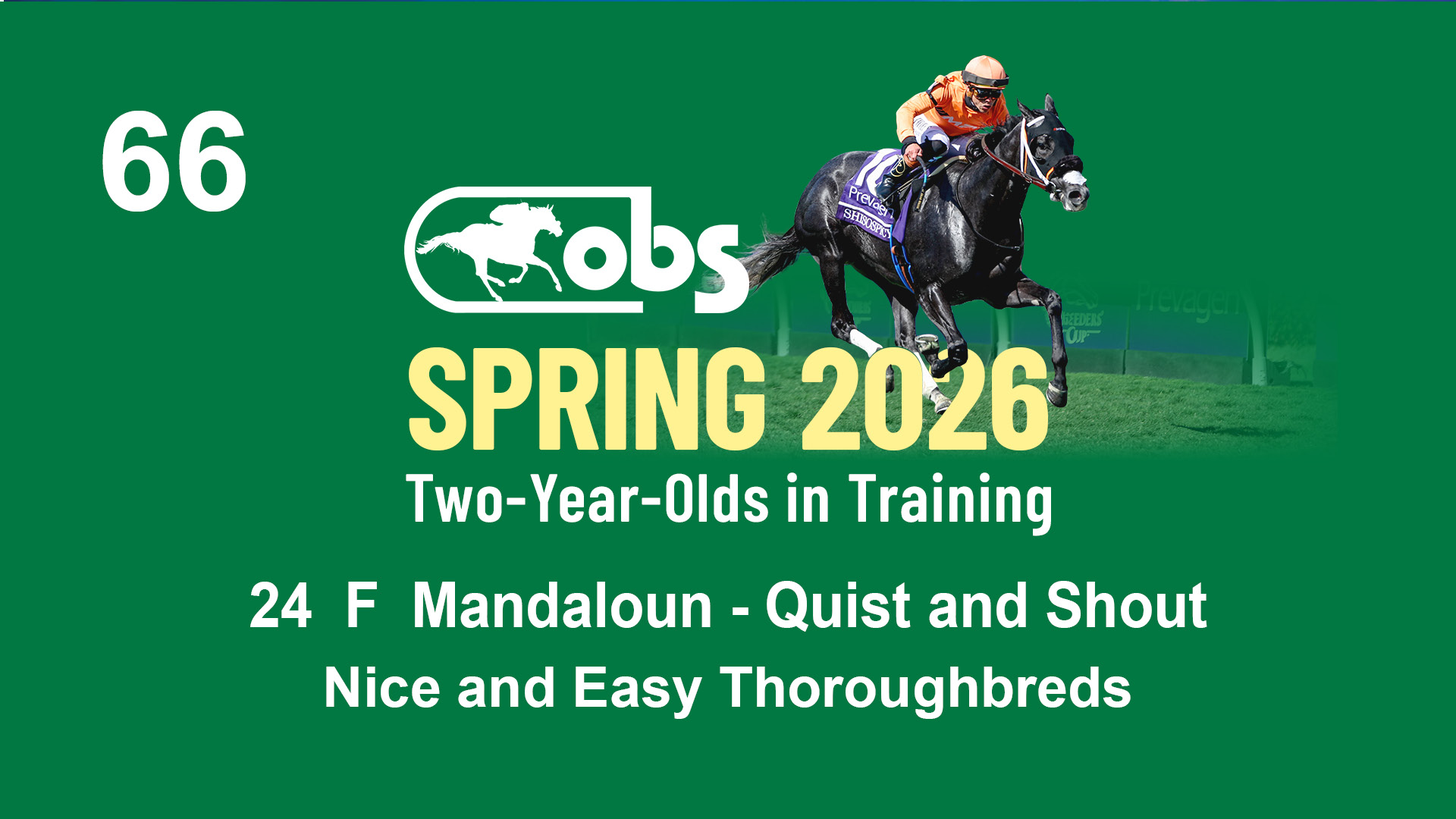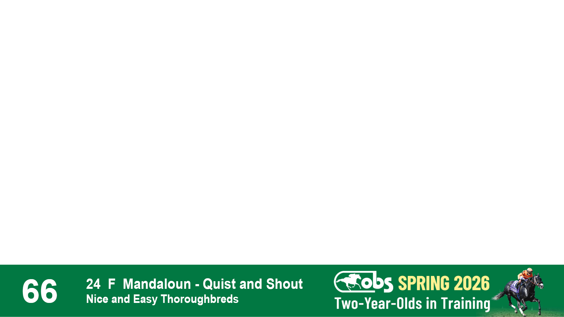 | 66 | Slate | Lower-Third | 4/7/2024 | F | Mandaloun | Quist and Shout | Nice and Easy Thoroughbreds | 140 | 700 | 872 | 683 | |
