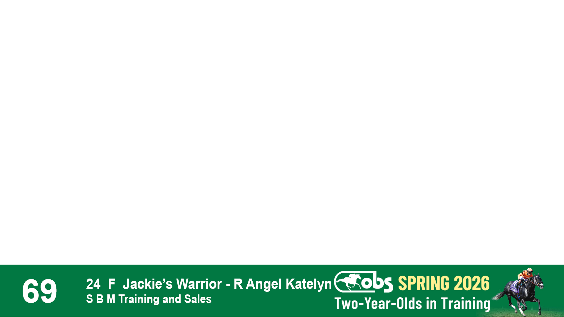 | 69 | Slate | Lower-Third | 5/7/2024 | F | Jackie's Warrior | R Angel Katelyn | S B M Training and Sales, Agent | 143 | 592 | 875 | 911 | |
