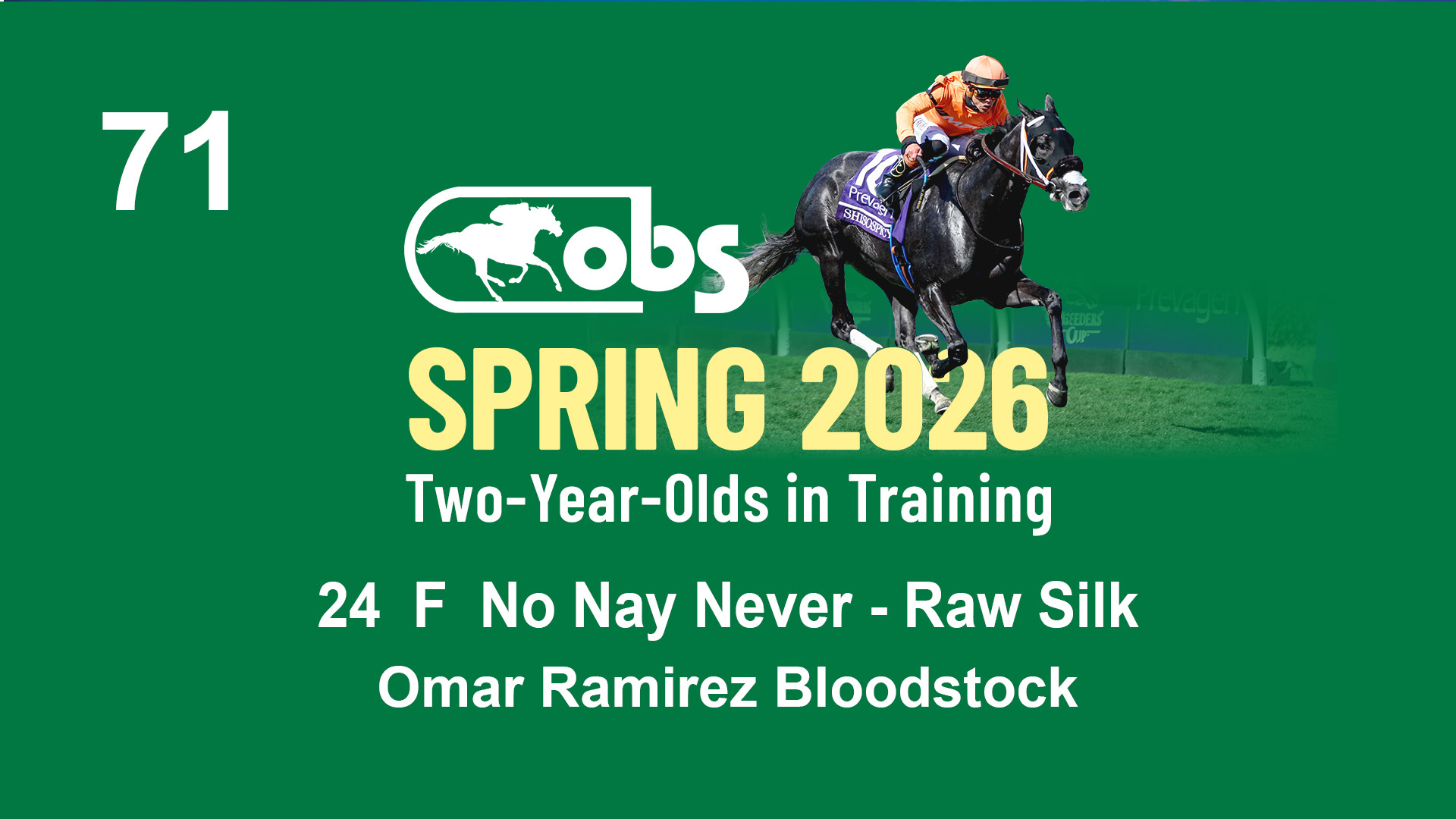 | 71 | Slate | Lower-Third | 1/8/2024 | F | No Nay Never | Raw Silk | Omar Ramirez Bloodstock, Agent VIII | 145 | 860 | 877 | 734 | |