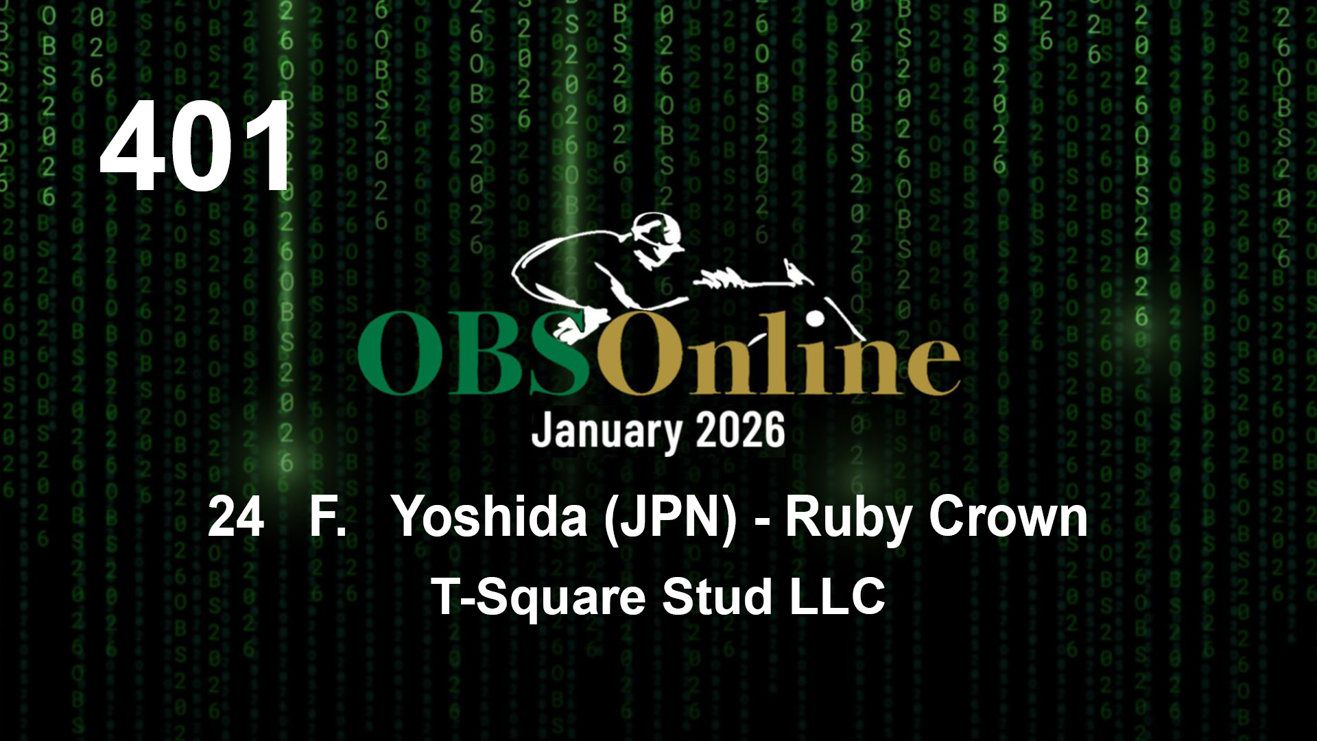 | 401 | Slate | Lower-Third | 2/16/2024 | F | Yoshida (JPN) | Ruby Crown | T-Square Stud LLC, Agent | 8 | 16 | 13 | 16 | |