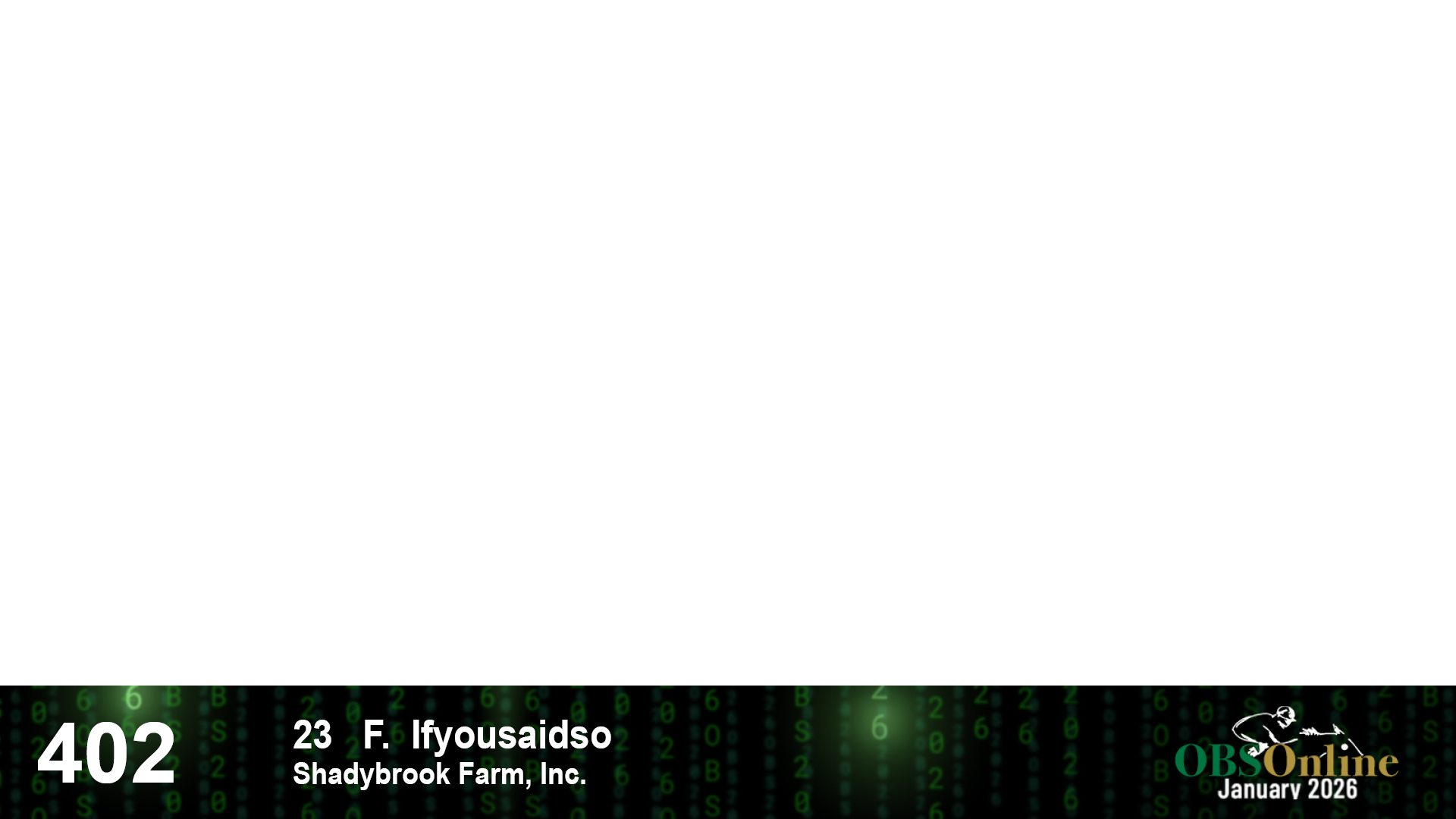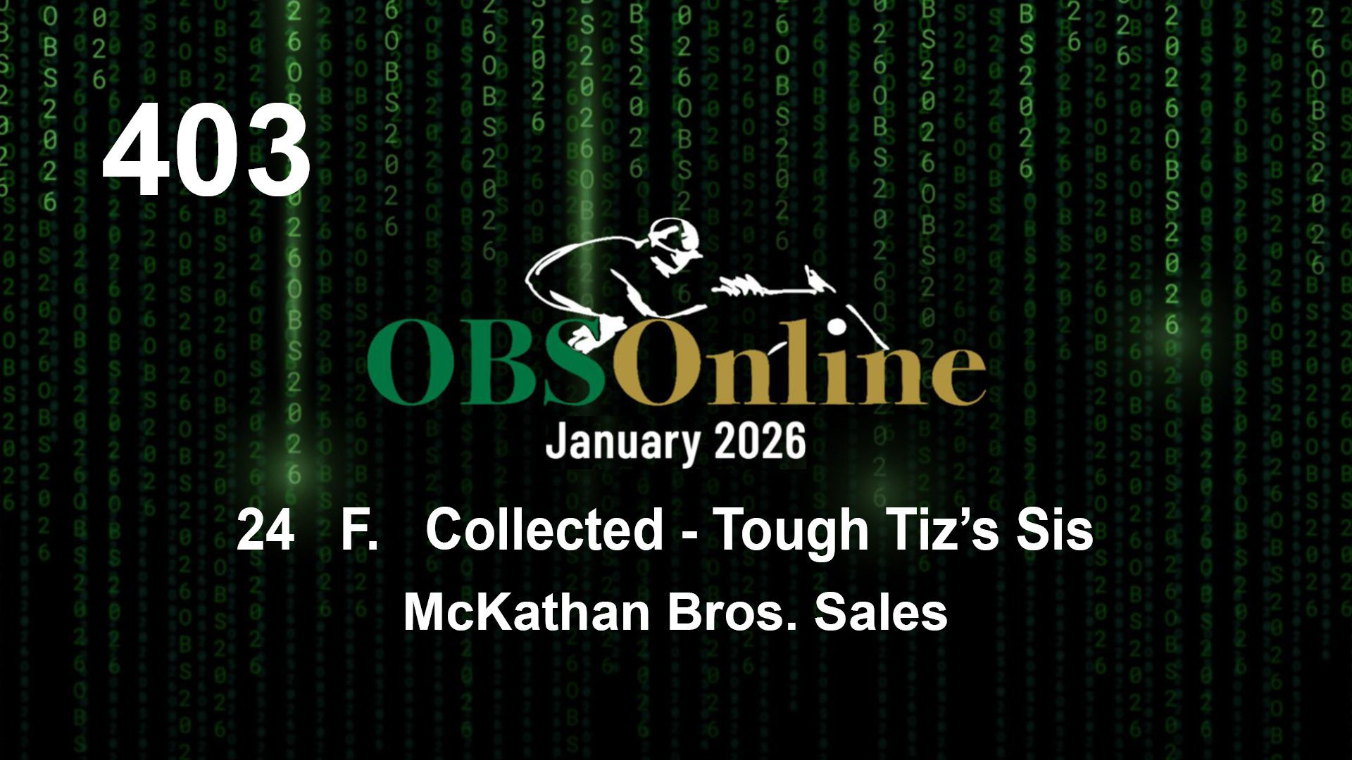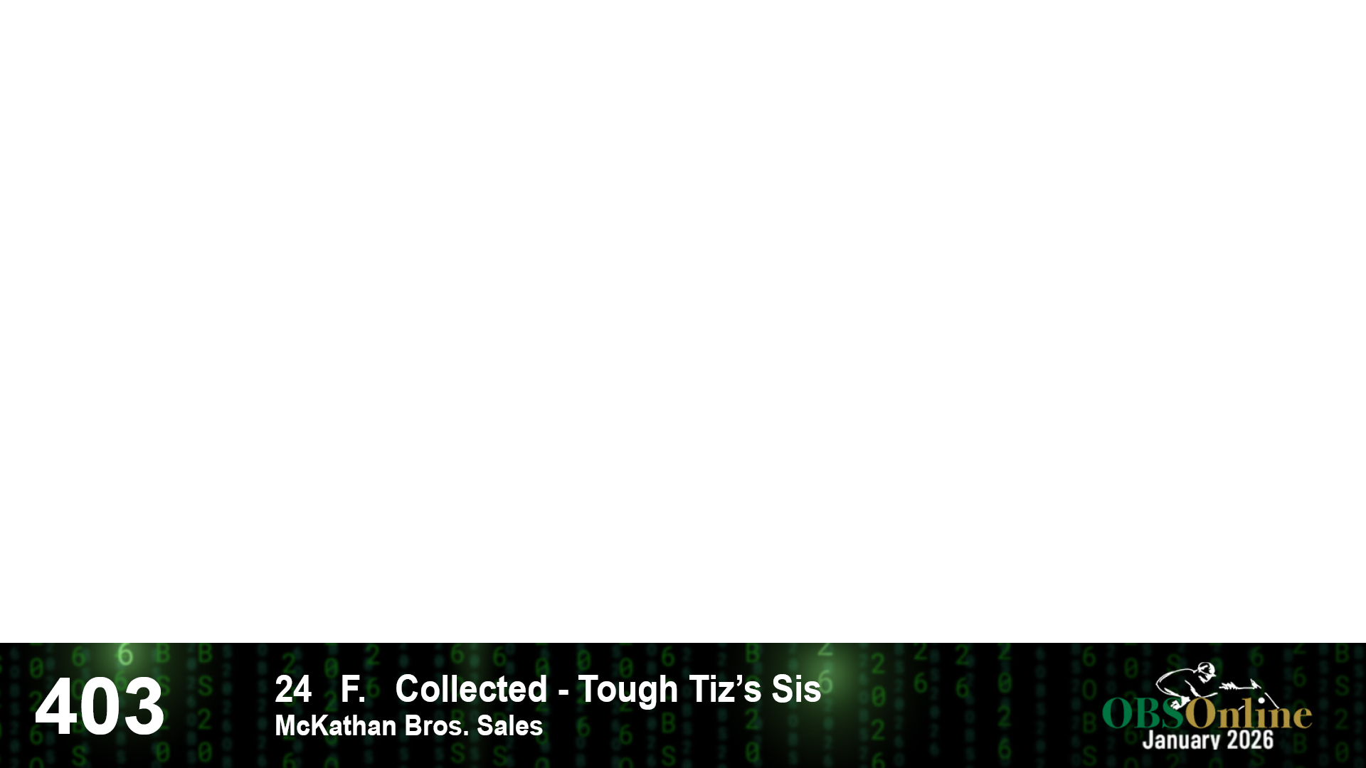 | 403 | Slate | Lower-Third | 5/26/2024 | F | Collected | Tough Tiz's Sis | McKathan Bros. Sales, Agent I | 9 | 6 | 15 | 8 | |