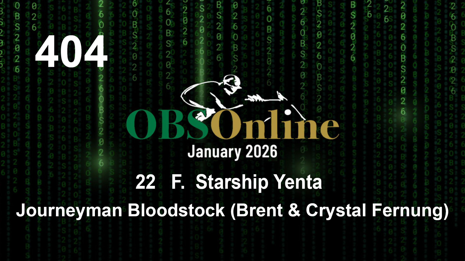 | 404 | Slate | Lower-Third | 3/5/2022 | F | Starship Yenta | Caracaro | Yenta | Journeyman Bloodstock (Brent & Crystal Fernung), Agent | 7 | 3 | 16 | 6 |