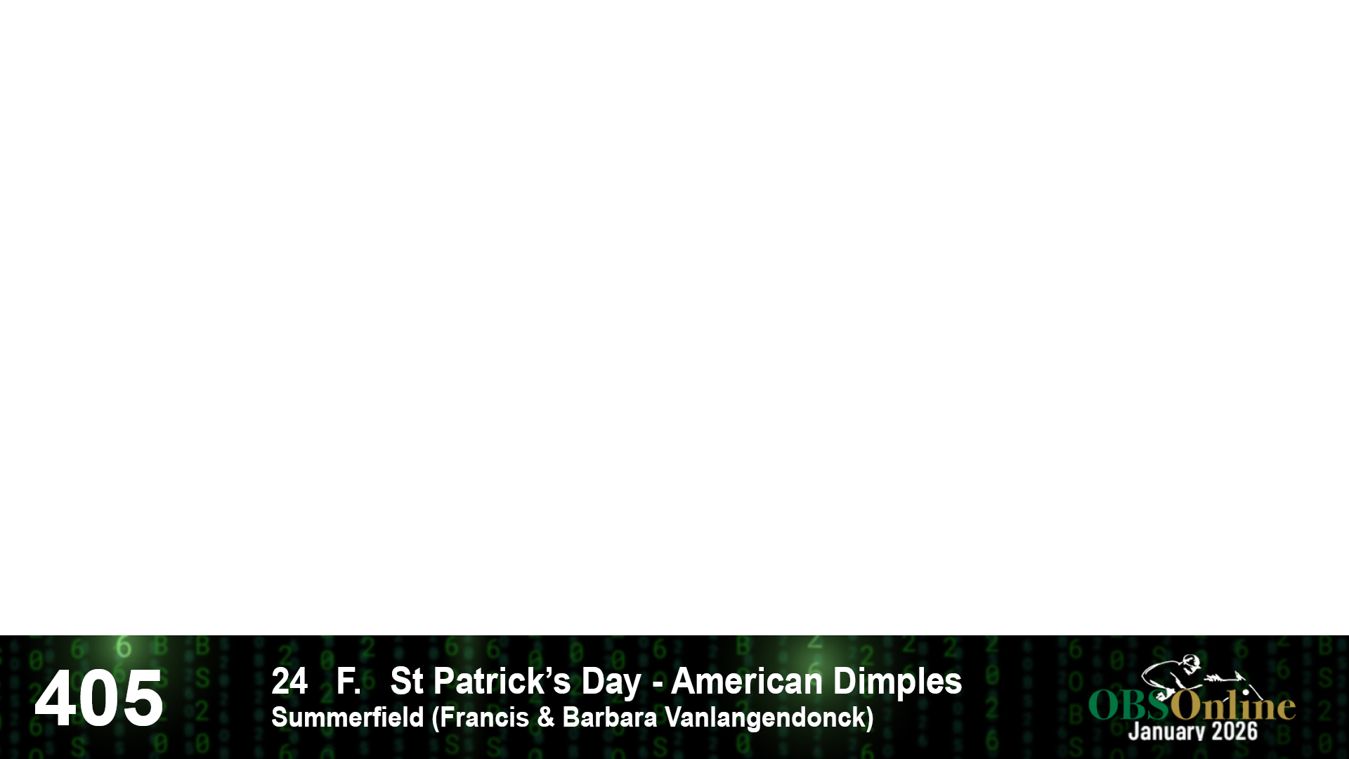 | 405 | Slate | Lower-Third | 4/28/2024 | F | St Patrick's Day | American Dimples | Summerfield (Francis & Barbara Vanlangendonck), Agent XXVII | 10 | 14 | 1 | 15 | |