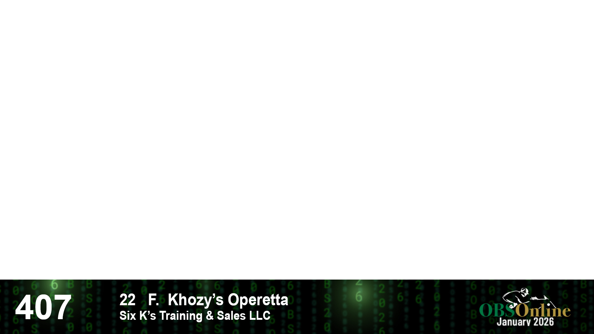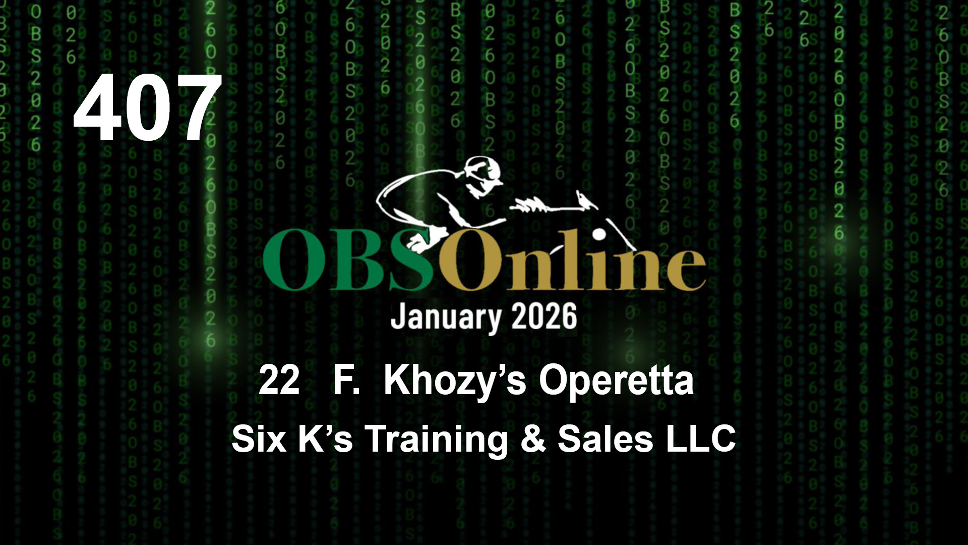 | 407 | Slate | Lower-Third | 1/31/2022 | F | Khozy's Operetta | Khozan | Boston Symphony | Six K's Training & Sales LLC, Agent | 3 | 11 | 2 | 13 |