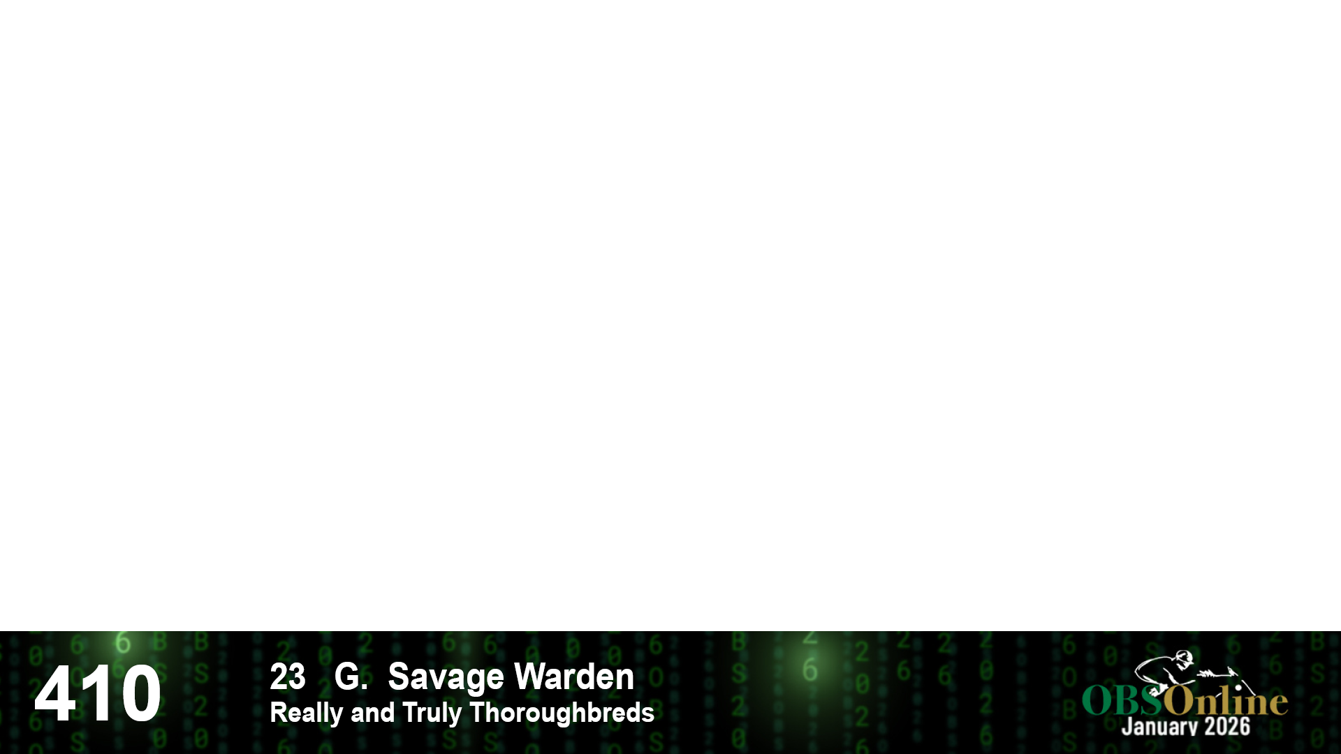 | 410 | Slate | Lower-Third | 4/10/2023 | G | Savage Warden | Code of Honor | Carmina Burana | Really and Truly Thoroughbreds | 6 | 5 | 5 | 10 |