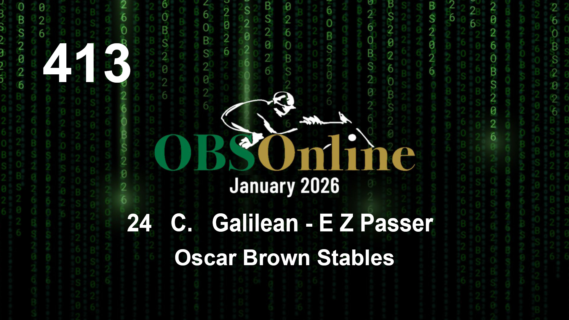 | 413 | Slate | Lower-Third | 2/23/2024 | C | Galilean | E Z Passer | Oscar Brown Stables | 15 | 7 | 8 | 9 | |