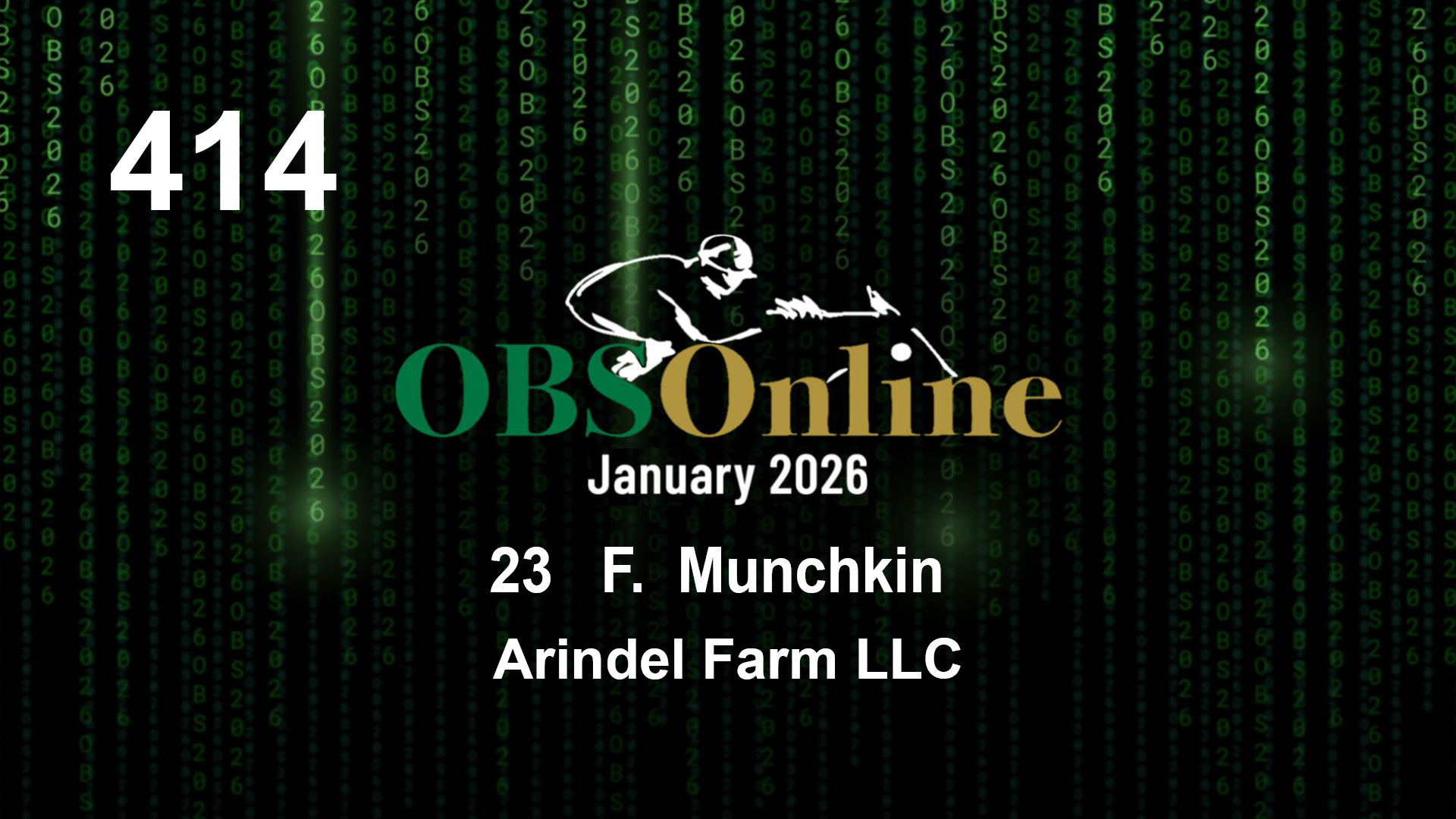 | 414 | Slate | Lower-Third | 4/28/2023 | F | Munchkin | Midshipman | Glinda | Arindel Farm LLC | 5 | 13 | 9 | 2 |