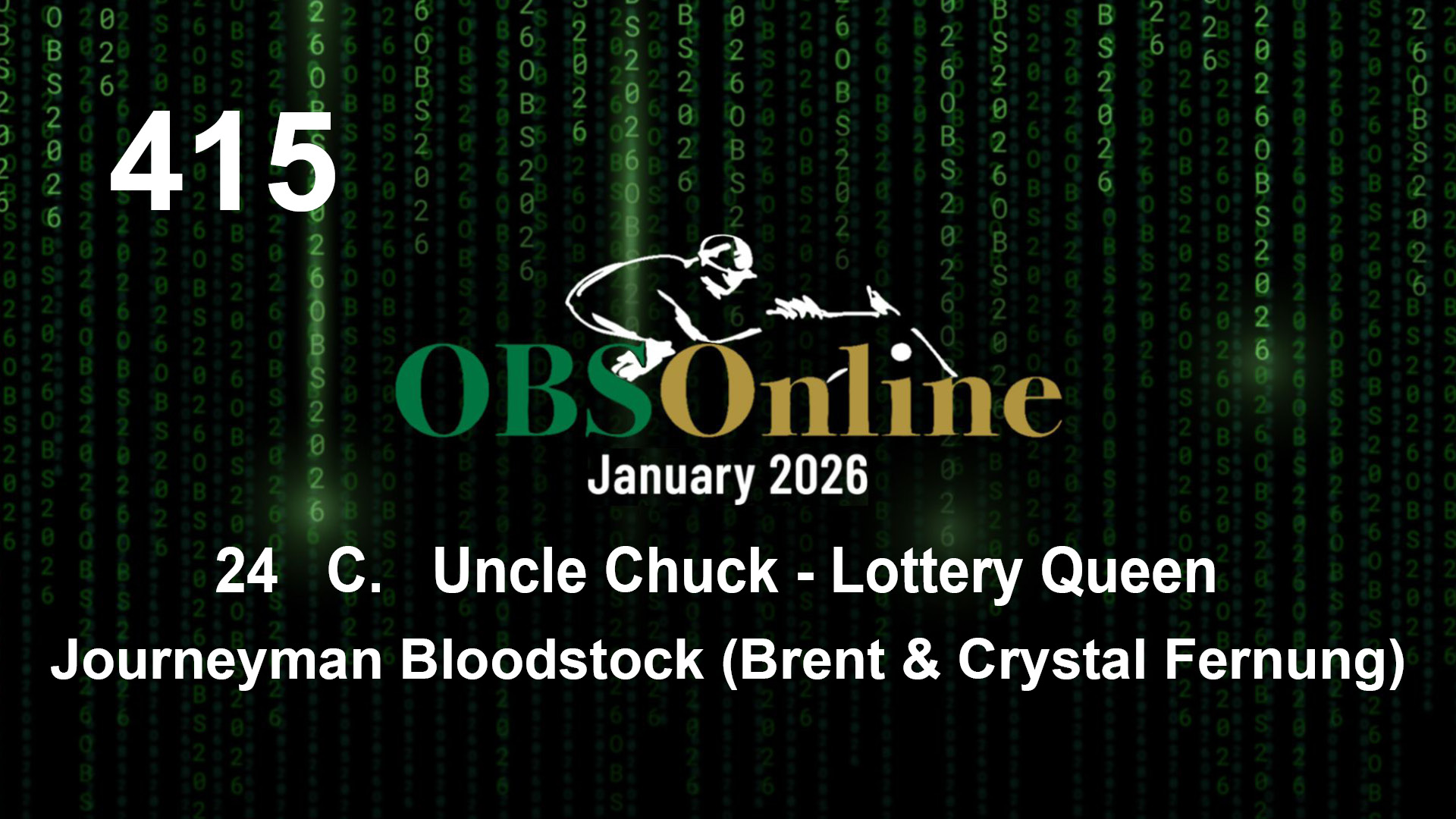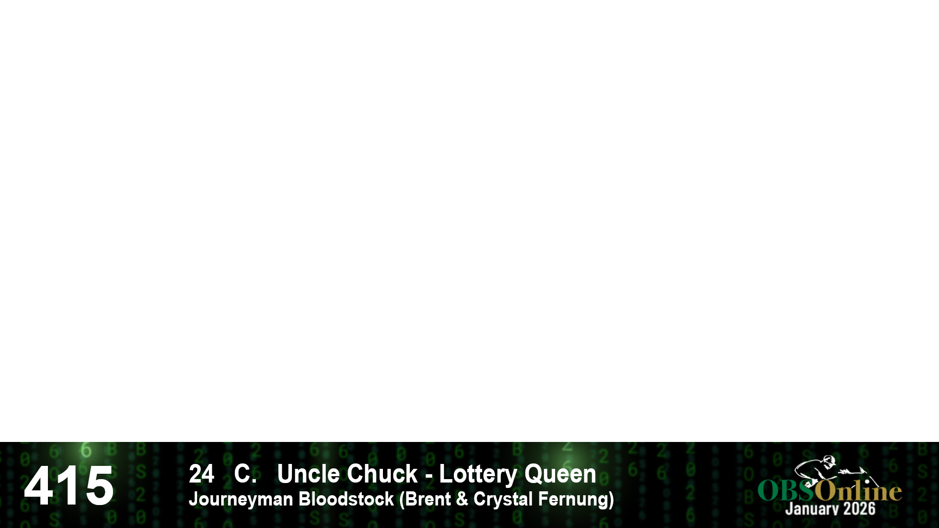| 415 | Slate | Lower-Third | 2/8/2024 | C | Uncle Chuck | Lottery Queen | Journeyman Bloodstock (Brent & Crystal Fernung), Agent | 16 | 15 | 10 | 7 | |