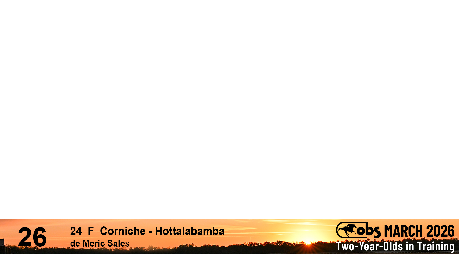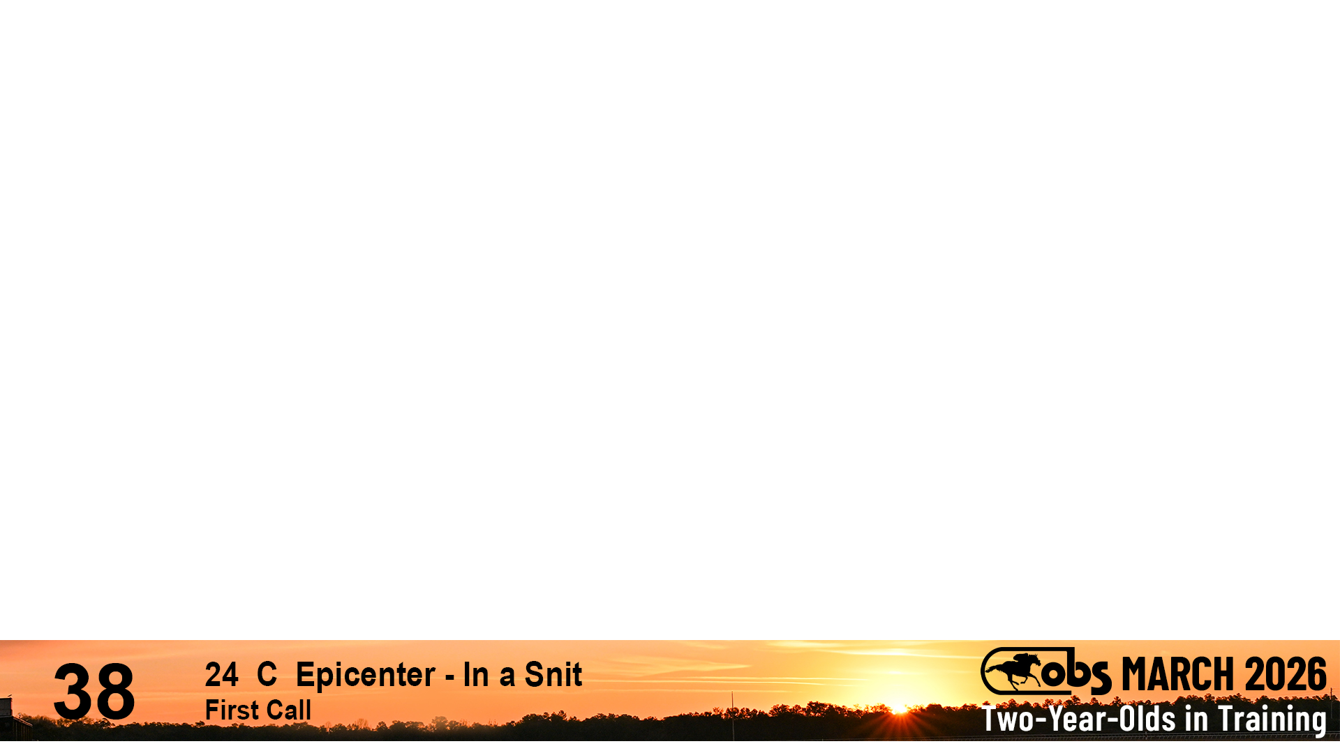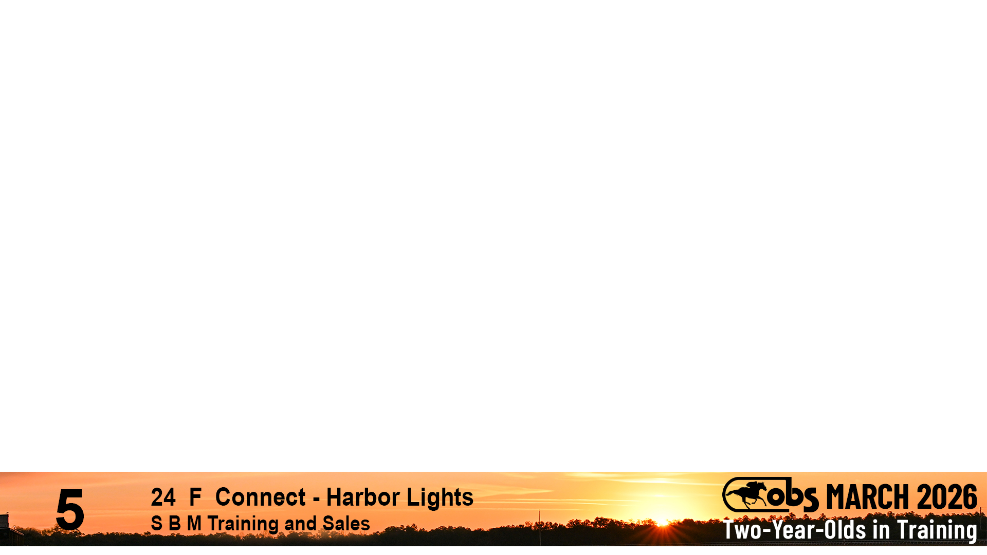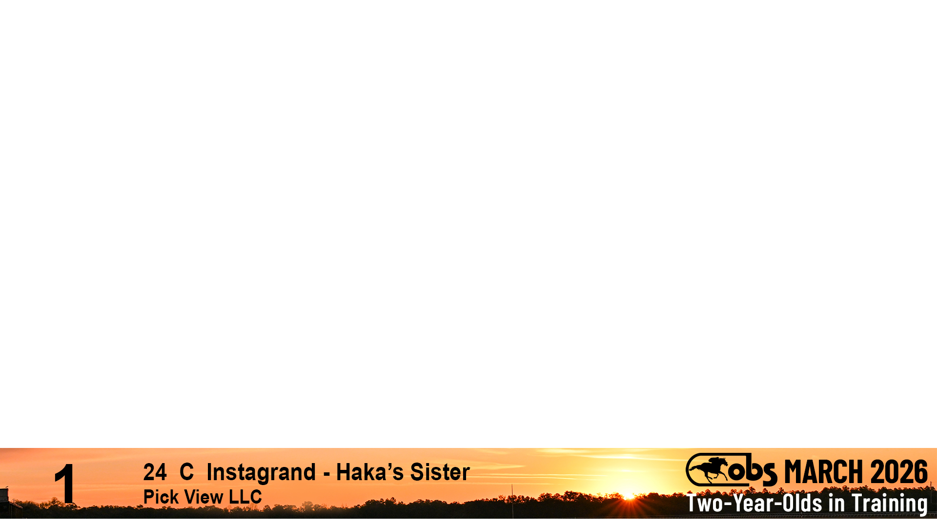 | 89 | Slate | Lower-Third | 3/12/2024 | C | Boston Bird | Noble Bird | Lailoni | S G V Thoroughbreds LLC (Steven Venosa), Agent | 3 | 598 | 383 | 649 |
