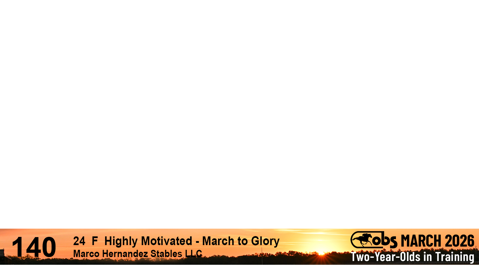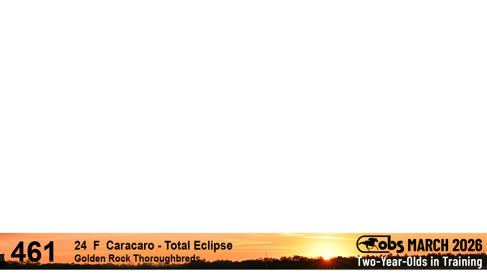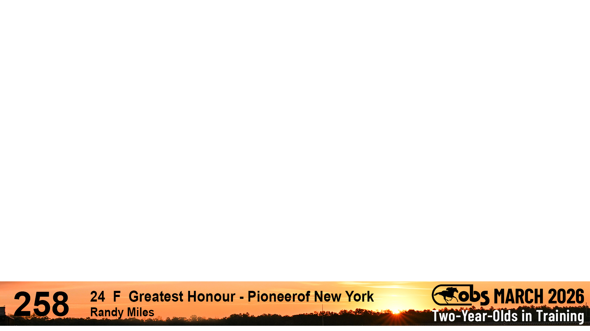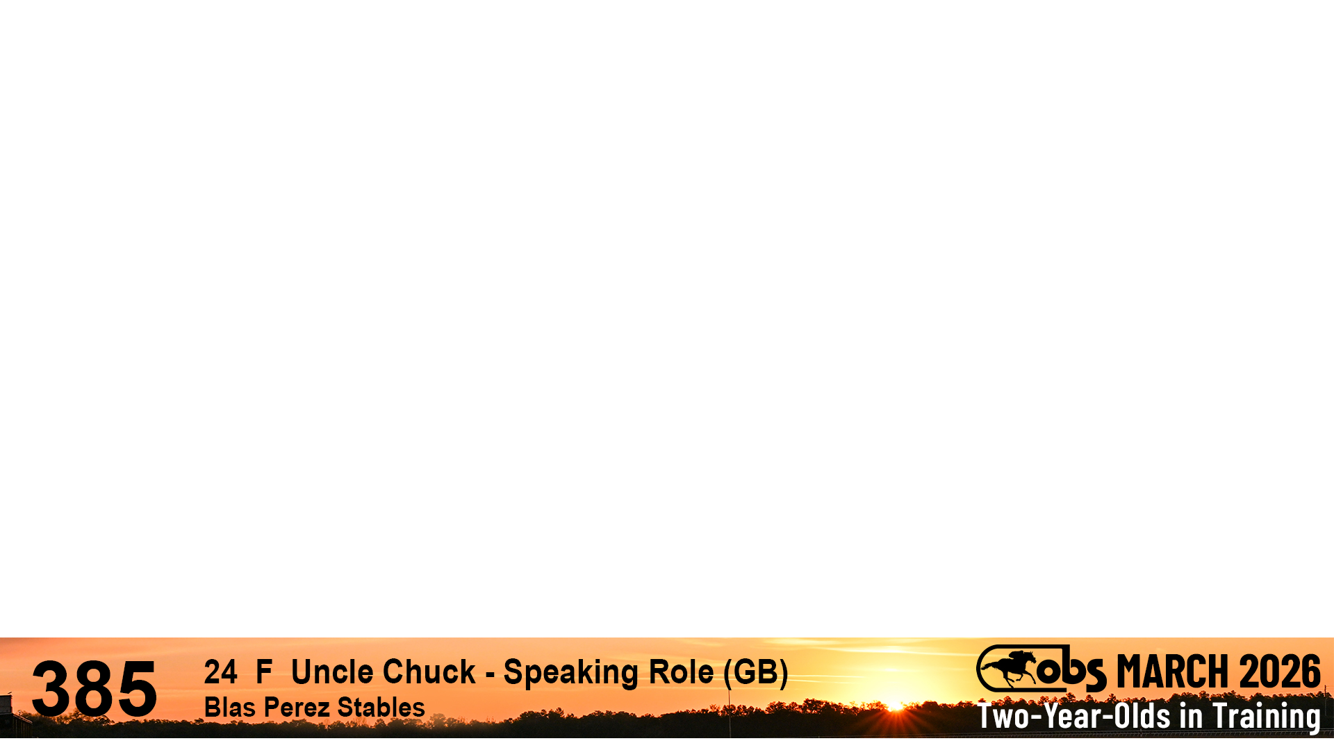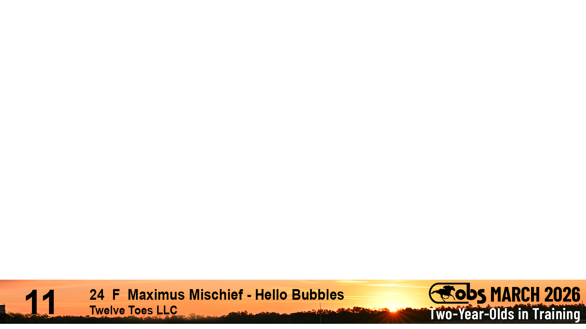 | 89 | Slate | Lower-Third | 3/12/2024 | C | Boston Bird | Noble Bird | Lailoni | S G V Thoroughbreds LLC (Steven Venosa), Agent | 3 | 598 | 383 | 649 |