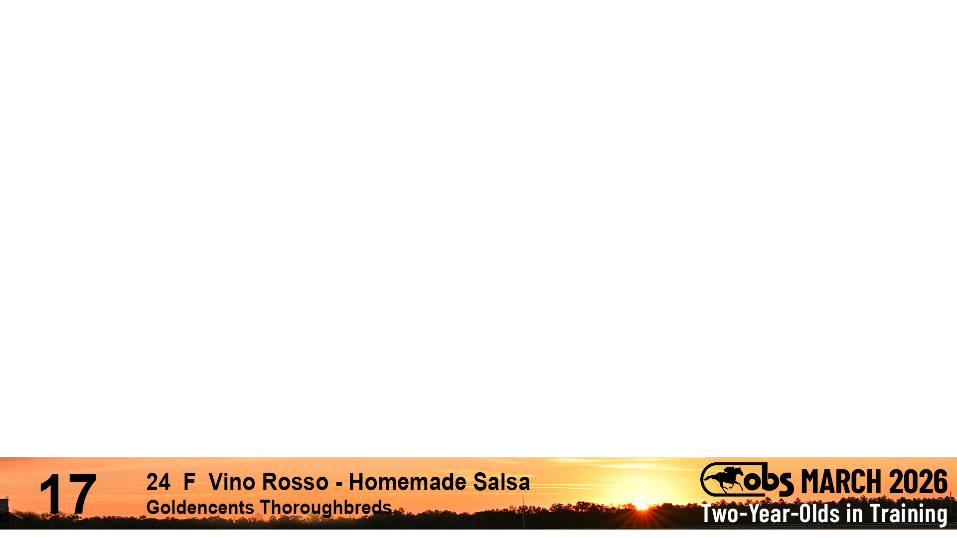 | 17 | Slate | Lower-Third | 5/15/2024 | F | Vino Rosso | Homemade Salsa | Goldencents Thoroughbreds, Agent IV | 62 | 772 | 311 | 198 | |