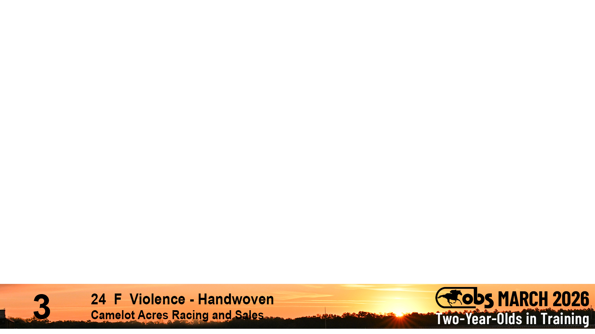 | 3 | Slate | Lower-Third | 2/17/2024 | F | Violence | Handwoven | Camelot Acres Racing and Sales, Agent II | 50 | 778 | 297 | 80 | |