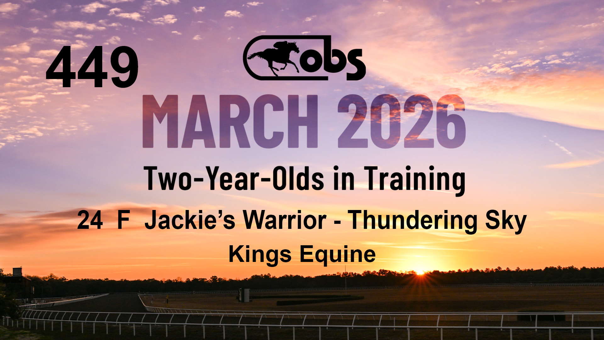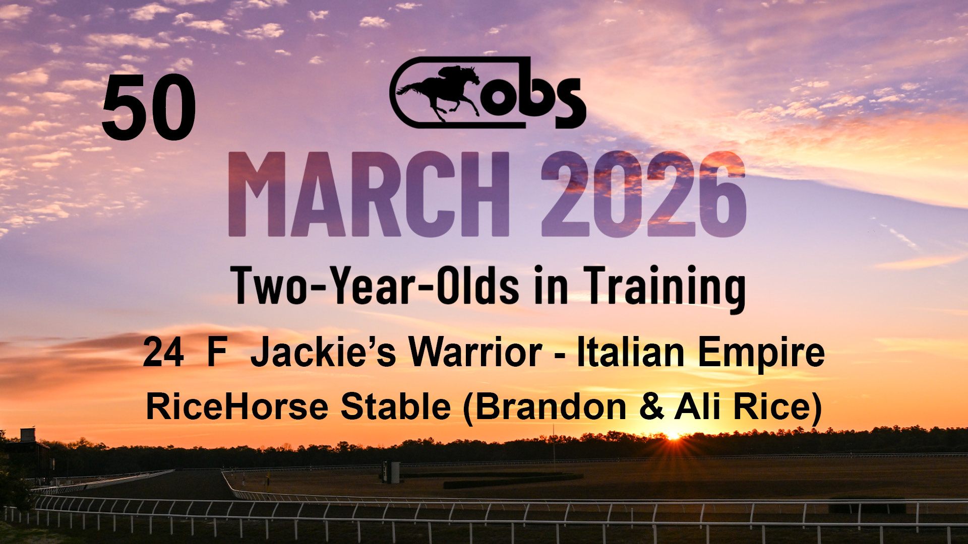 | 50 | Slate | Lower-Third | 3/30/2024 | F | Jackie's Warrior | Italian Empire | RiceHorse Stable (Brandon & Ali Rice) | 93 | 396 | 344 | 571 | |
