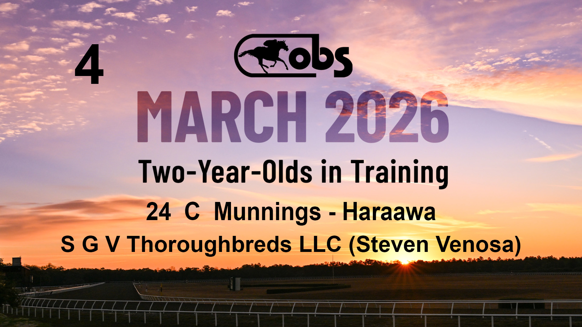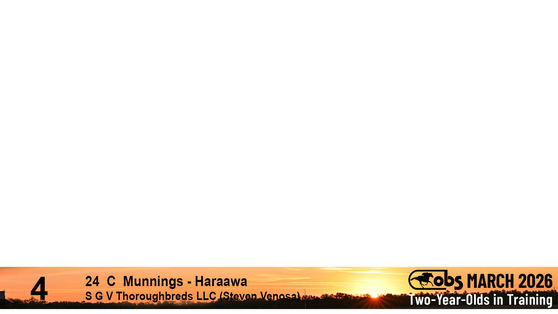 | 4 | Slate | Lower-Third | 3/8/2024 | C | My Habibi | Munnings | Haraawa | S G V Thoroughbreds LLC (Steven Venosa), Agent | 30 | 544 | 298 | 647 |